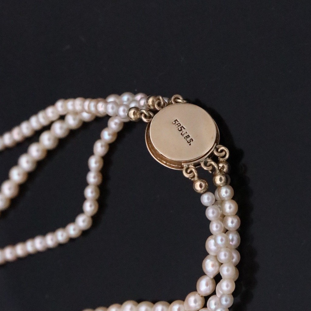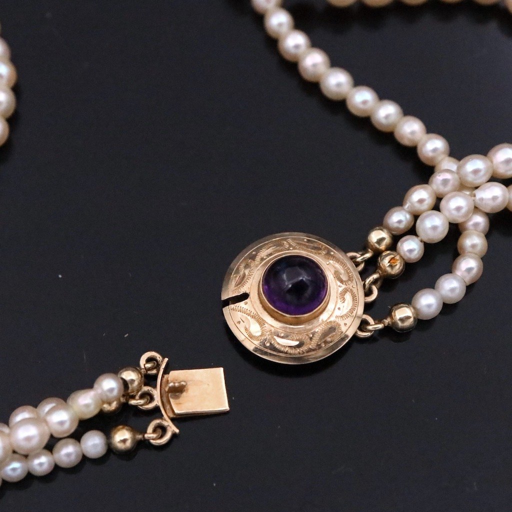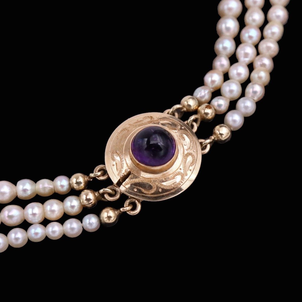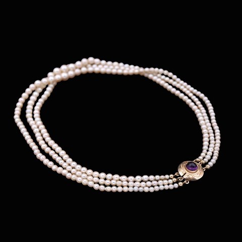 J. Bjerring Sørensen. Tre-radet perlekæde med lås i 14k guld med ametyst.