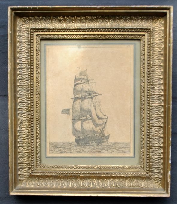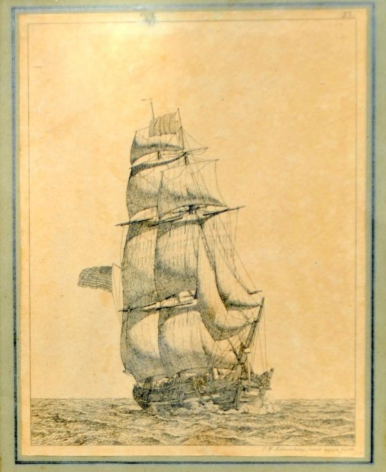 Eckersberg. Christoffer Wilhelm (1783 - 1853) Danmark: En nordamerikansk Brig. For fulde Seil styrer den i smult Vande lidt til H. Signeret: C. W. Eckersberg fecit aqua forti. Radering i zink. 22 x 17 cm.