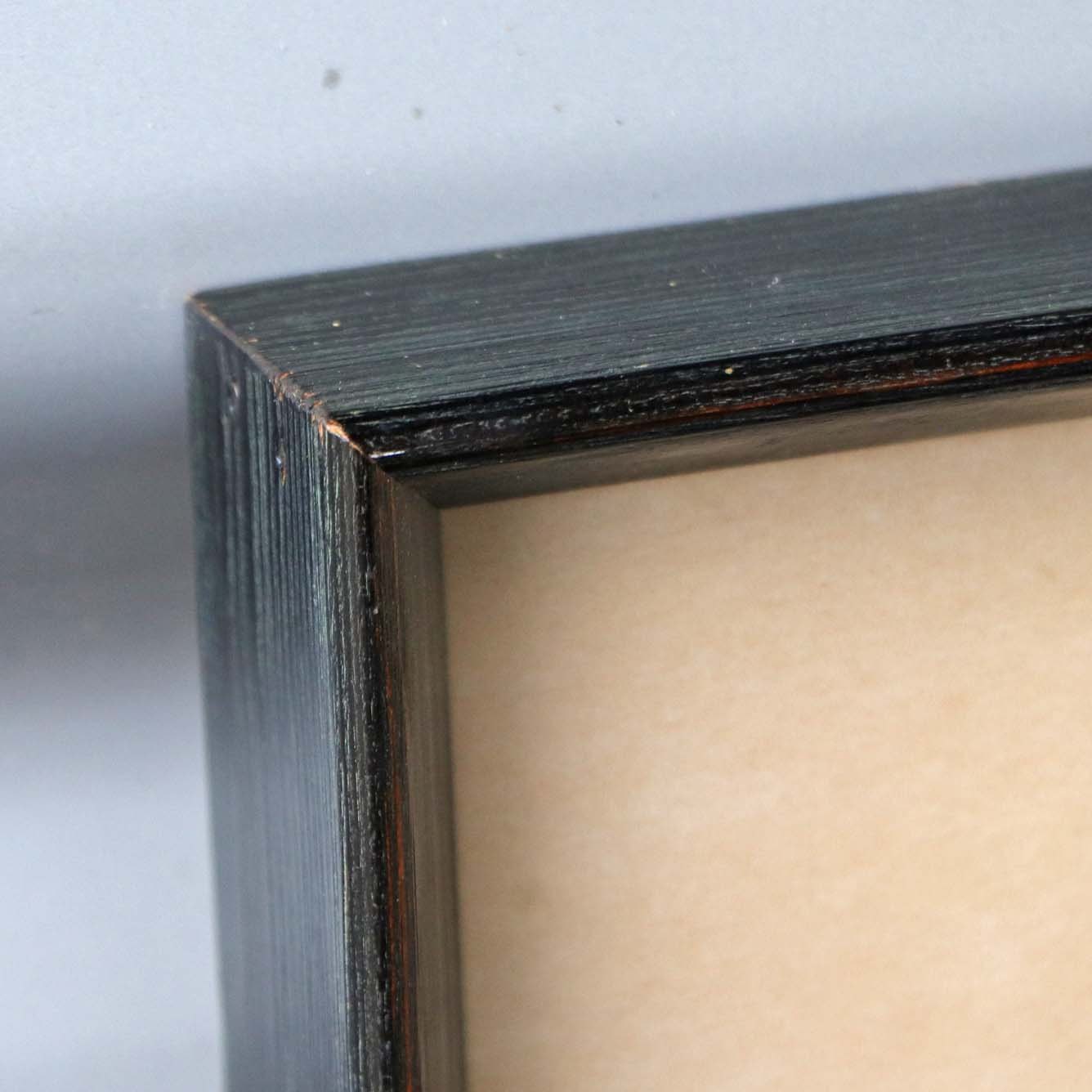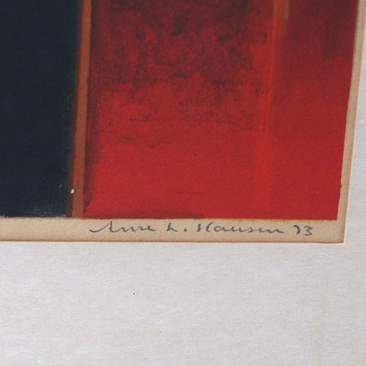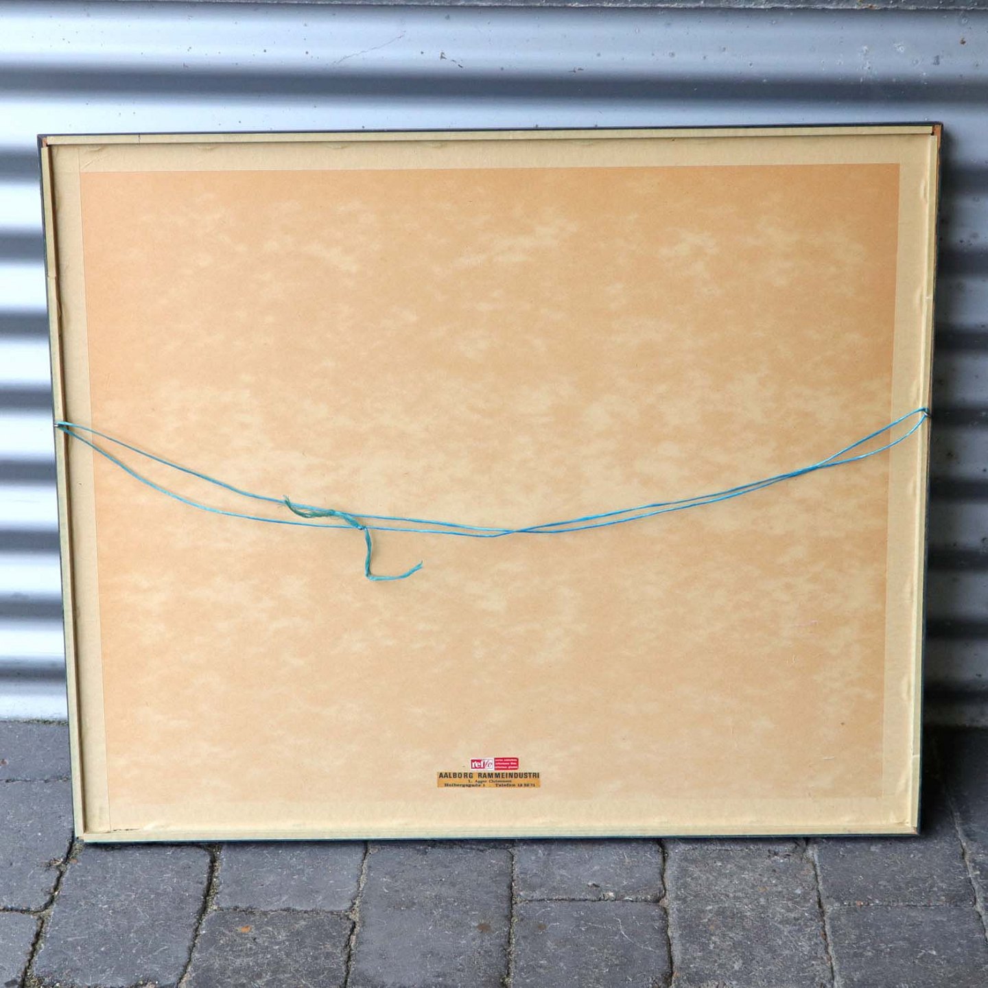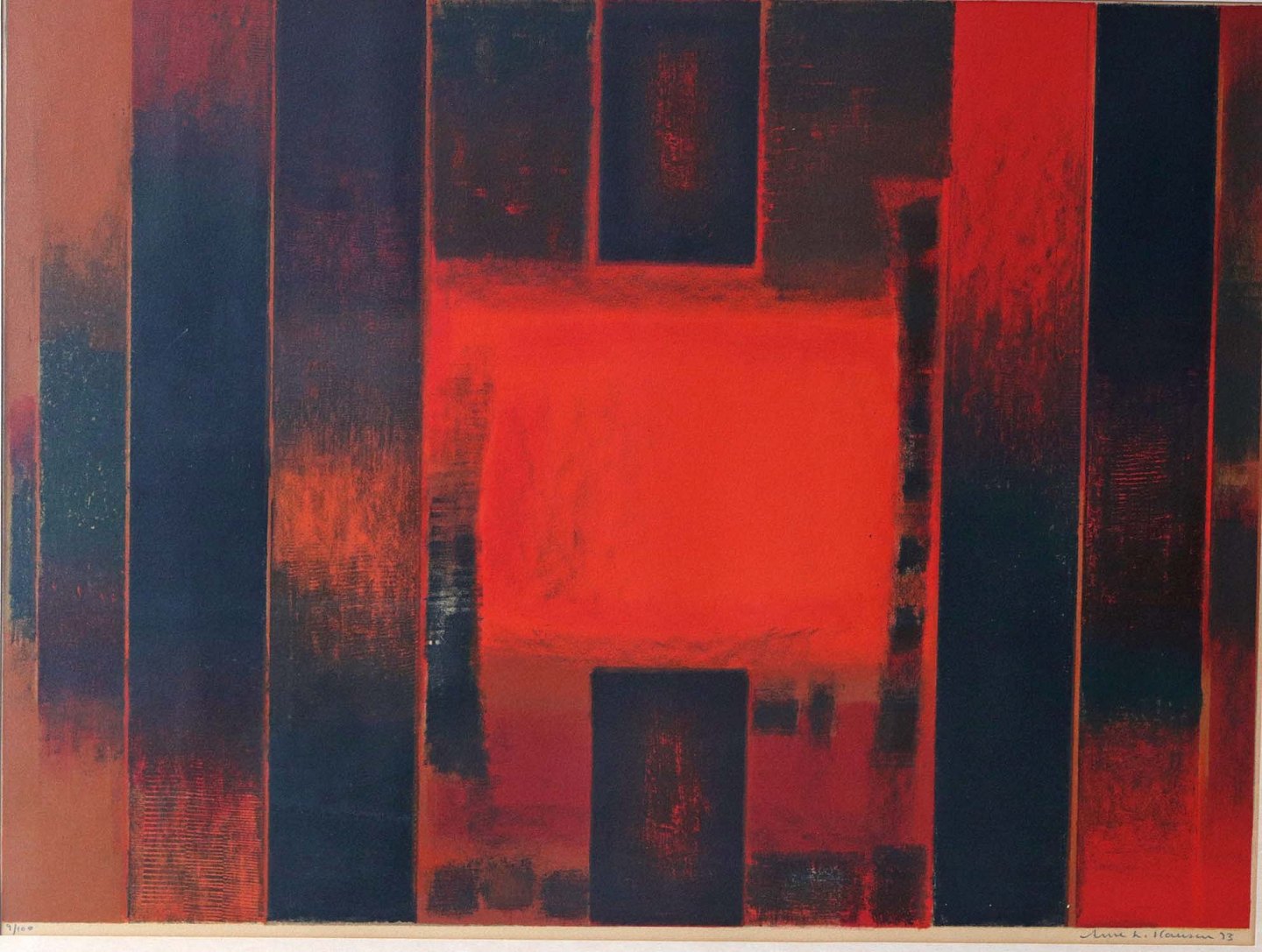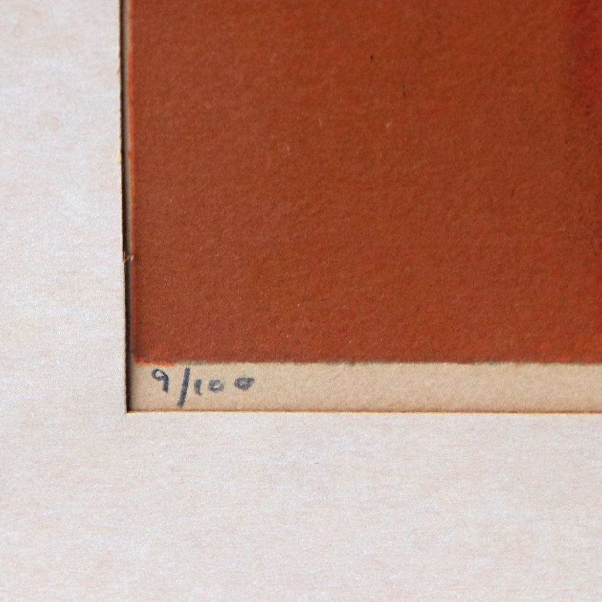 Indrammet litografi med passepartout i ramme. Litografisk tryk i kubisk stil nr 9/100 fra år 1973 med abstrakt motiv i røde, orange og sorte farver.