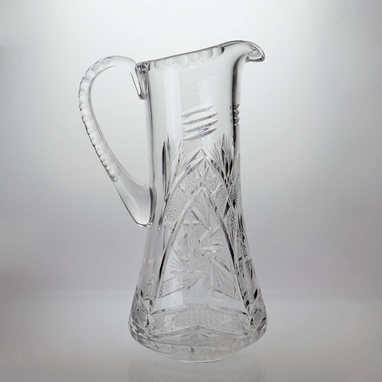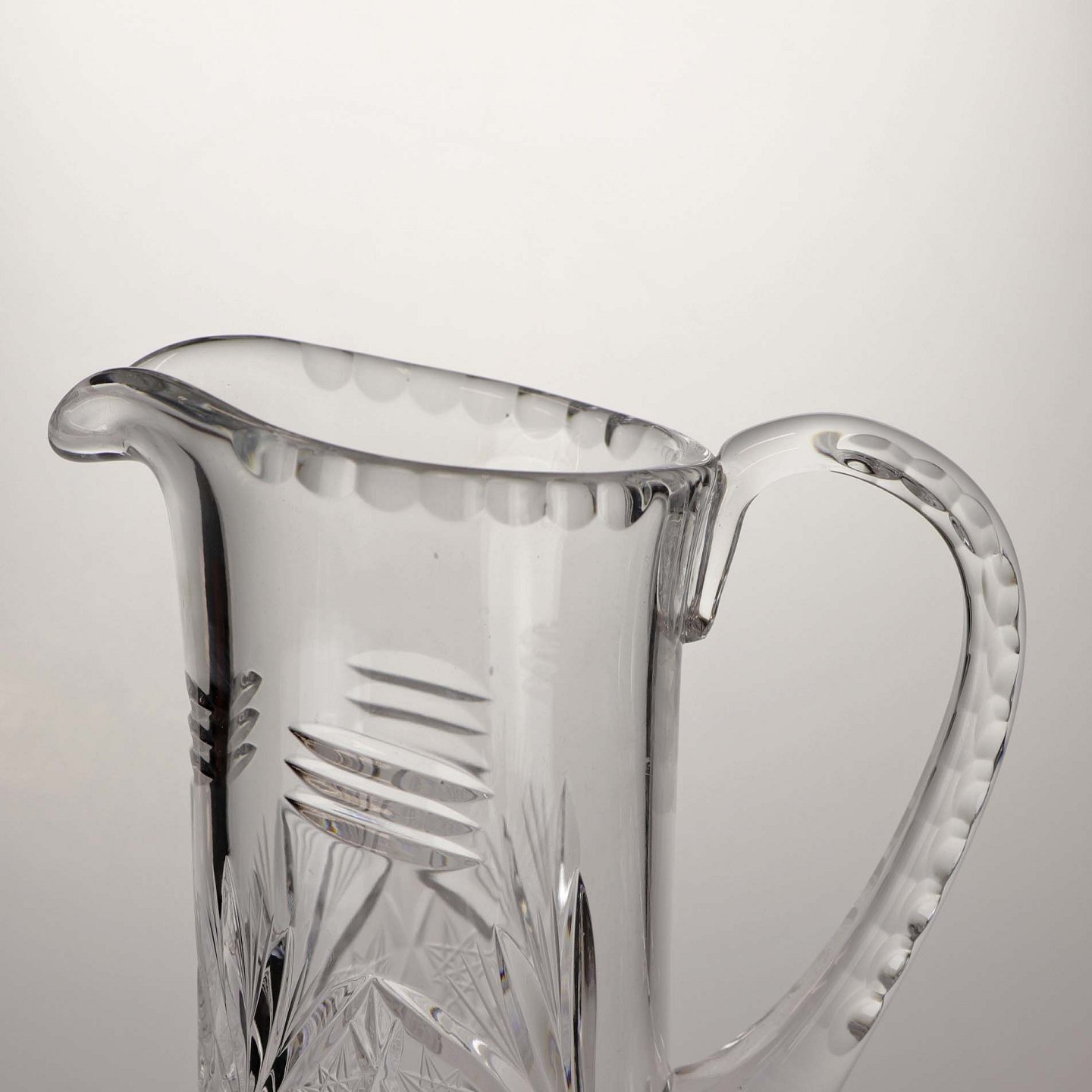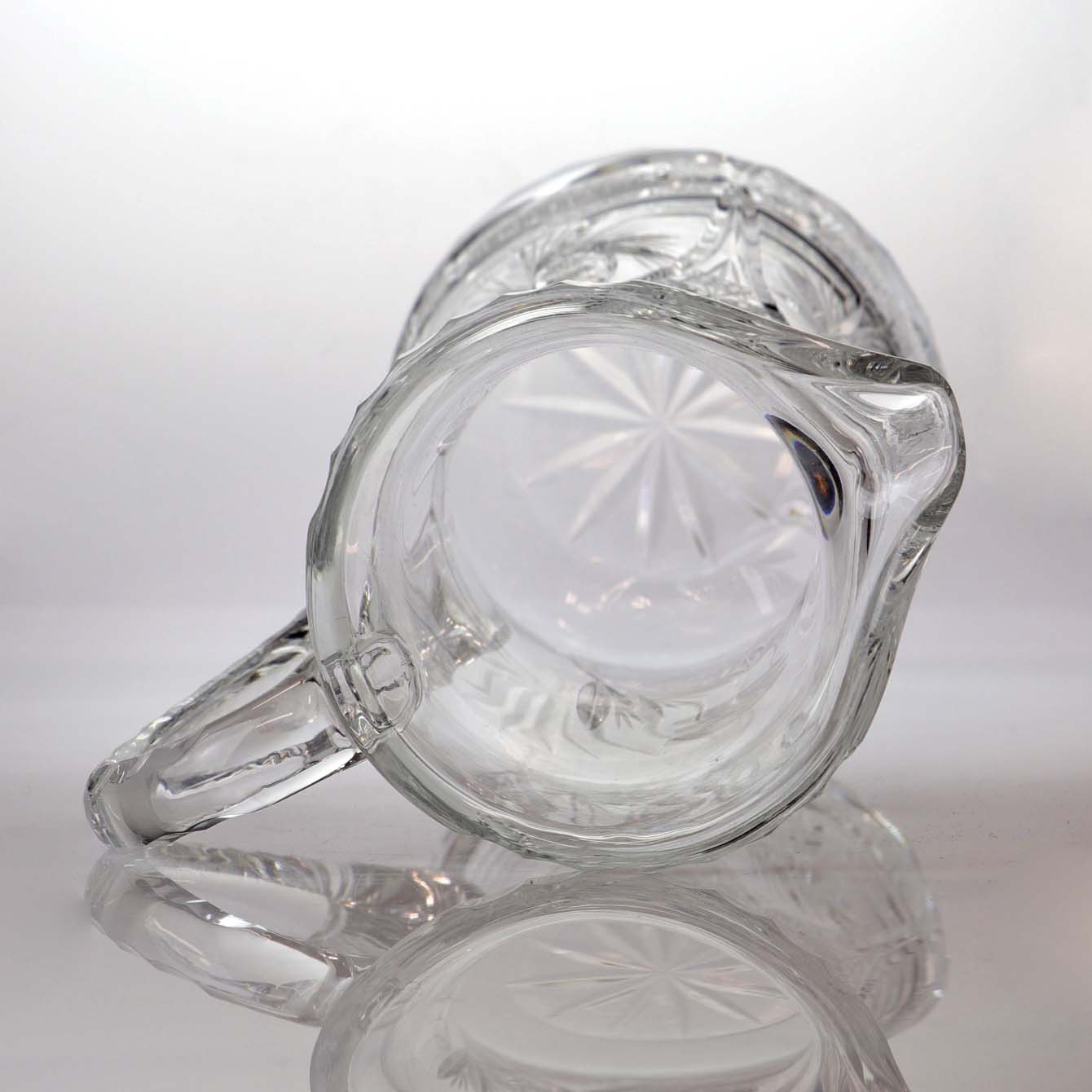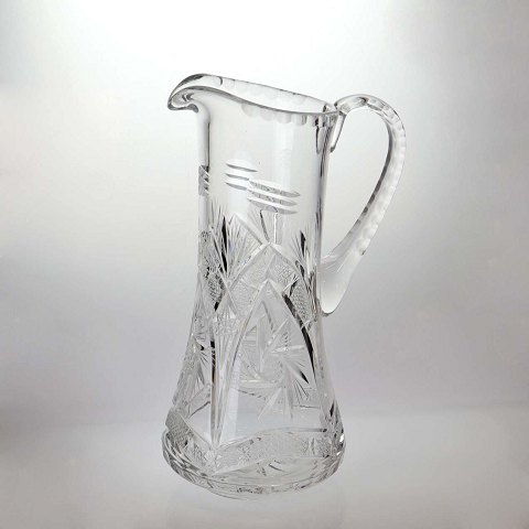 Stor kande i klart glas med slebet mønster på både kande og hank