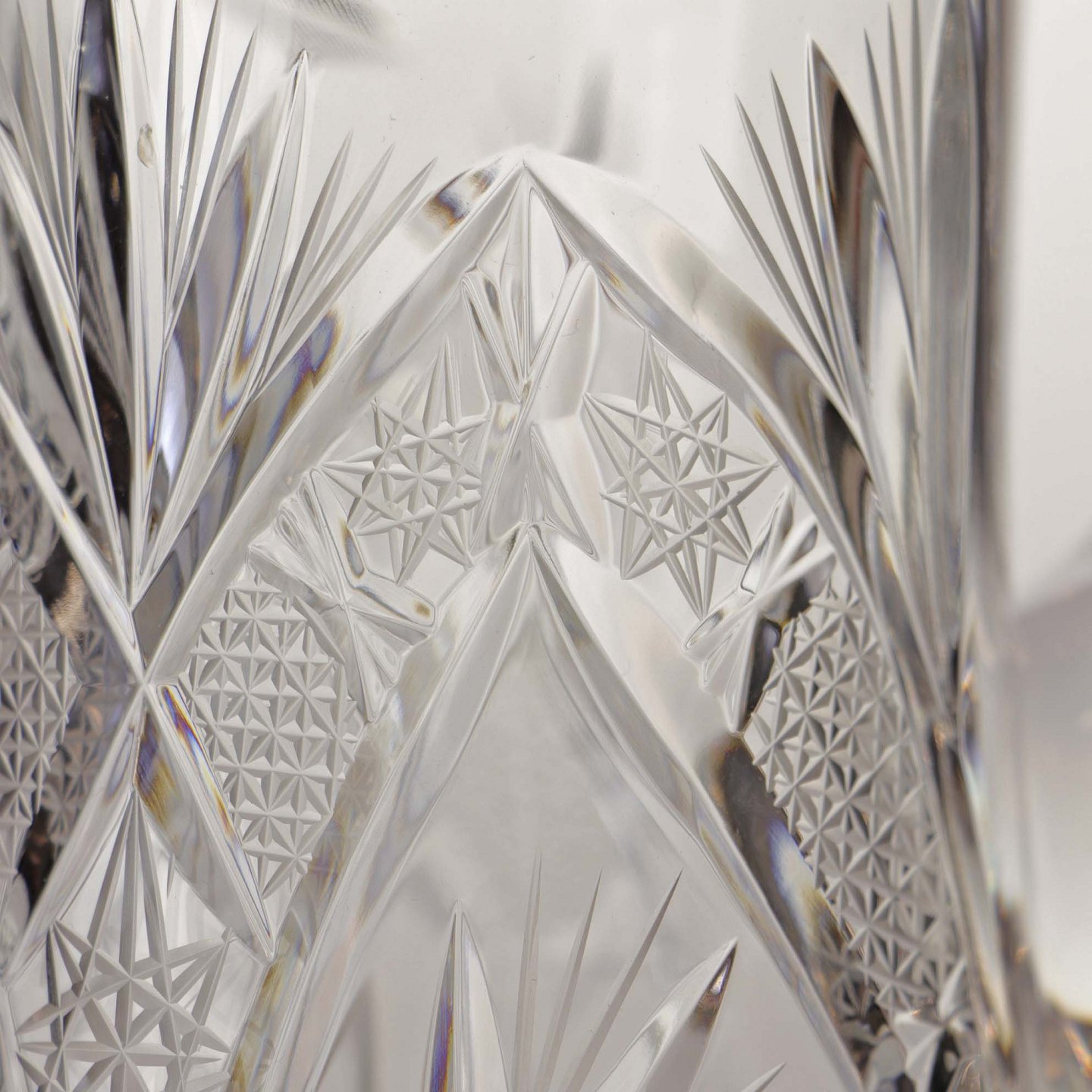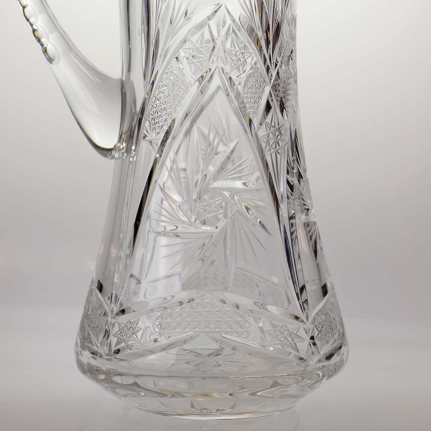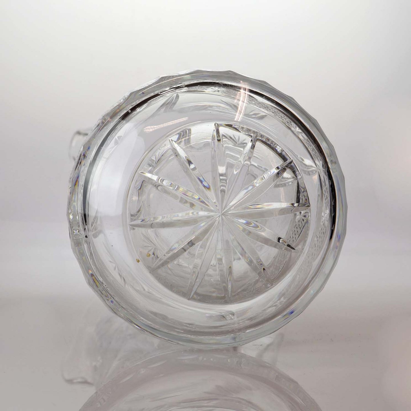 Stor kande i klart glas med slebet mønster på både kande og hank