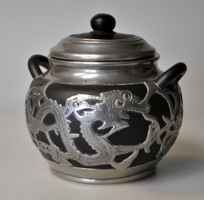 Chinese sugar bowl in stoneware with pewter mounting. Approx. 1930. Decoration with dragons. Stamped on bottom "Yee Dzu Ching CHEFOO N. China". Height: 10 cm. Dia.: 11 cm.
