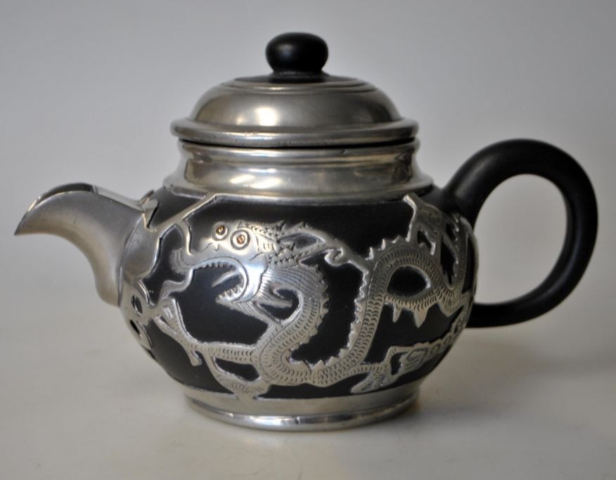Chinese stoneware teapot with pewter mounting, approx. 1930