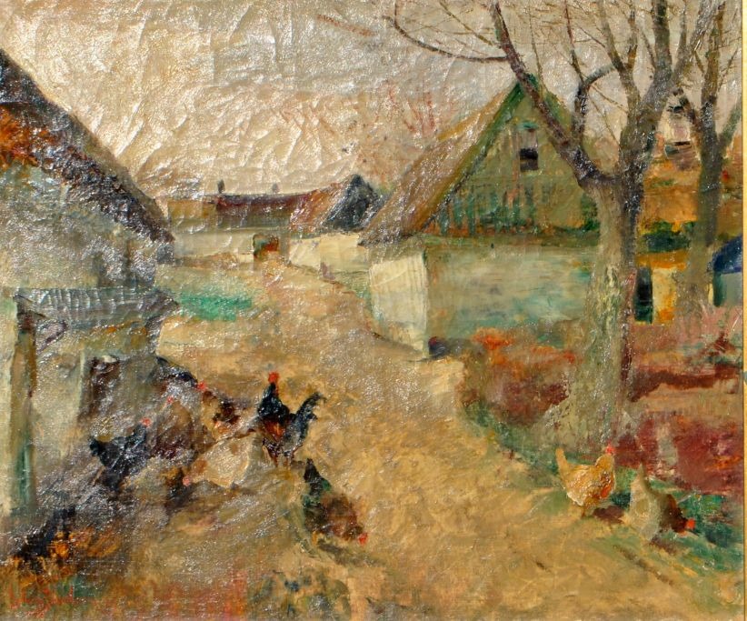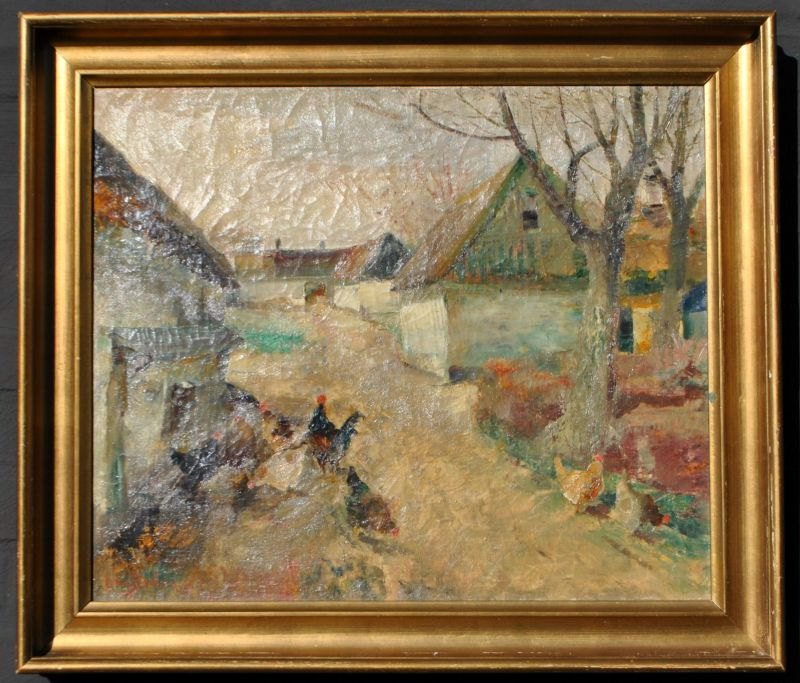 Jacobsen, Ludvig (1890 - 1957) Danmark: Høns ved bondegård. 1923. Olie på lærred. Signeret "Ludvig Jacobsen 23". 49 x 58 cm.