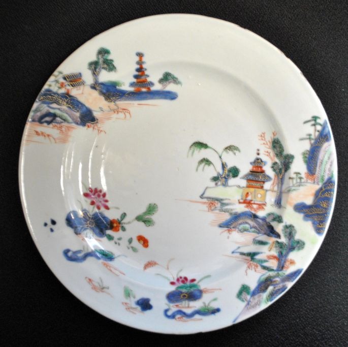 Kinesisk tallerken, 17/18. årh. Kangxi. Håndbemalede dekorationer i form af landskaber, træer og blomster. Polykrom dekoreret med forgyldning. Ustemplet. Dia.: 23 cm.