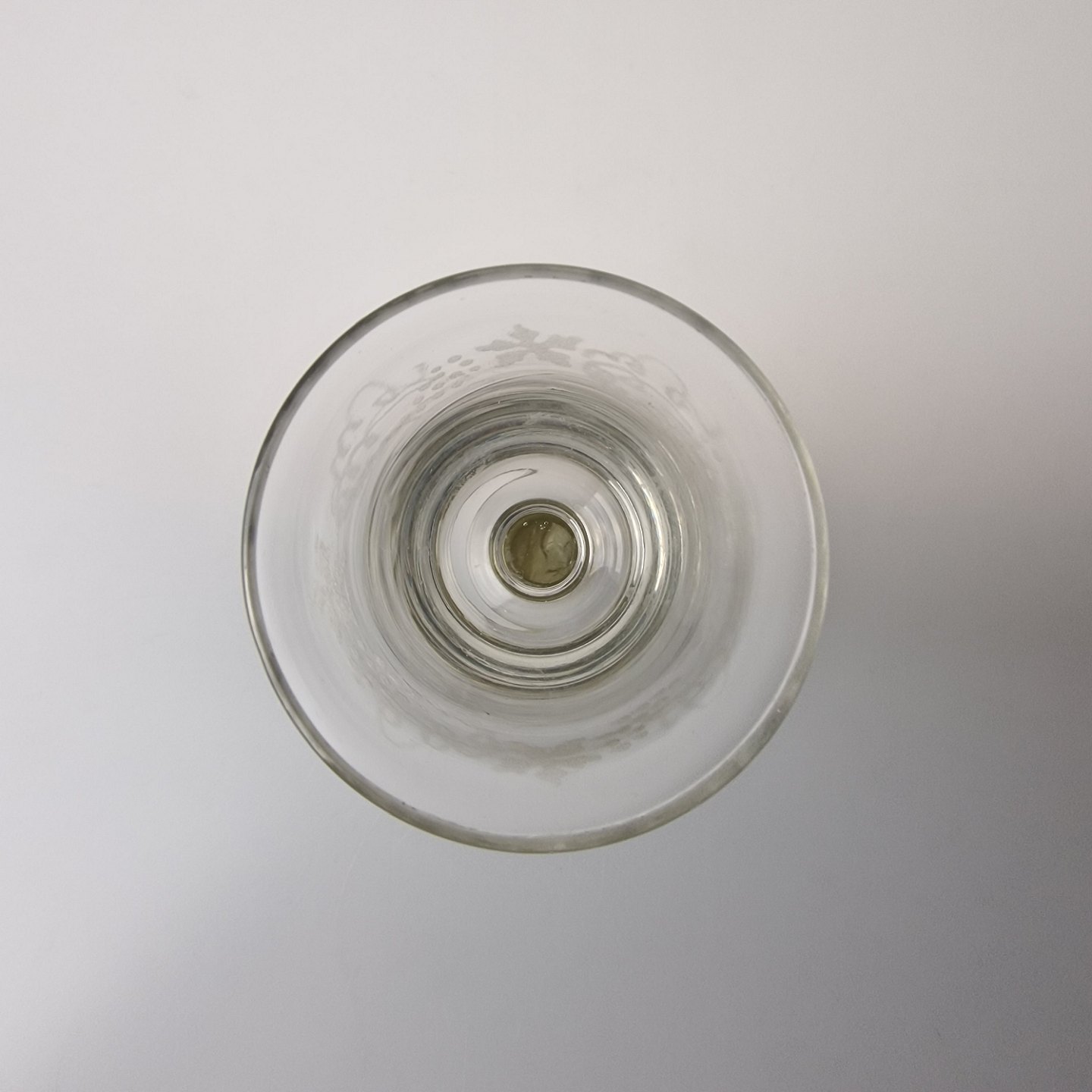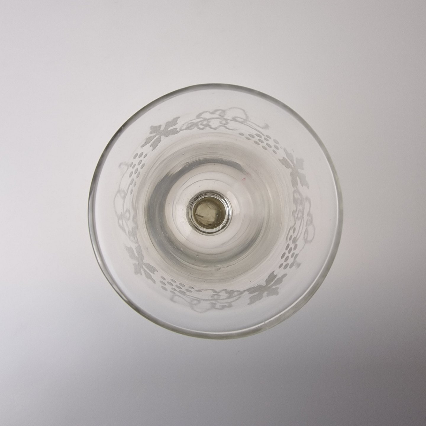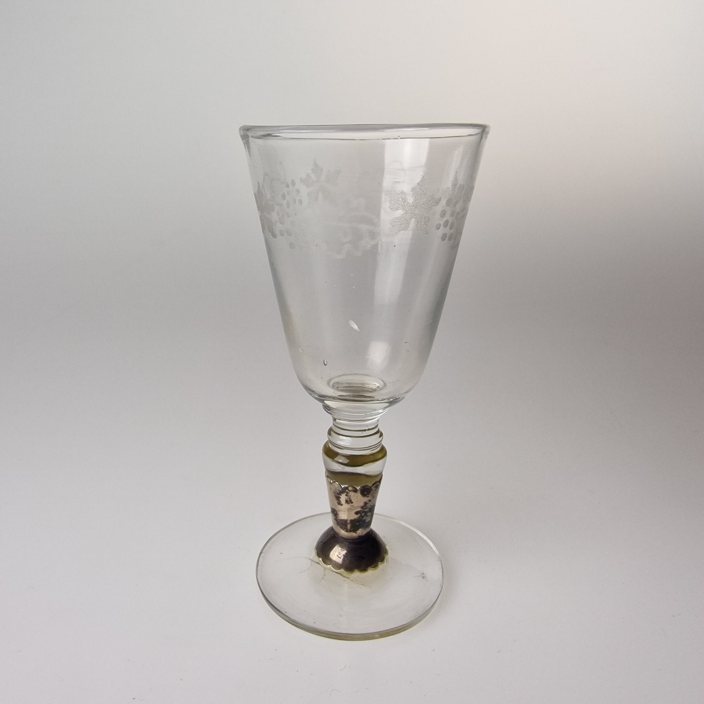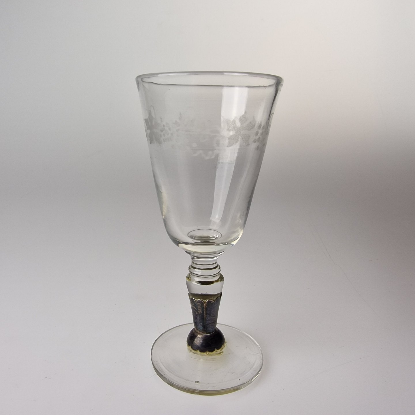 2 styk glas dekoreret med slebet vinranker og sølv omkring stilken