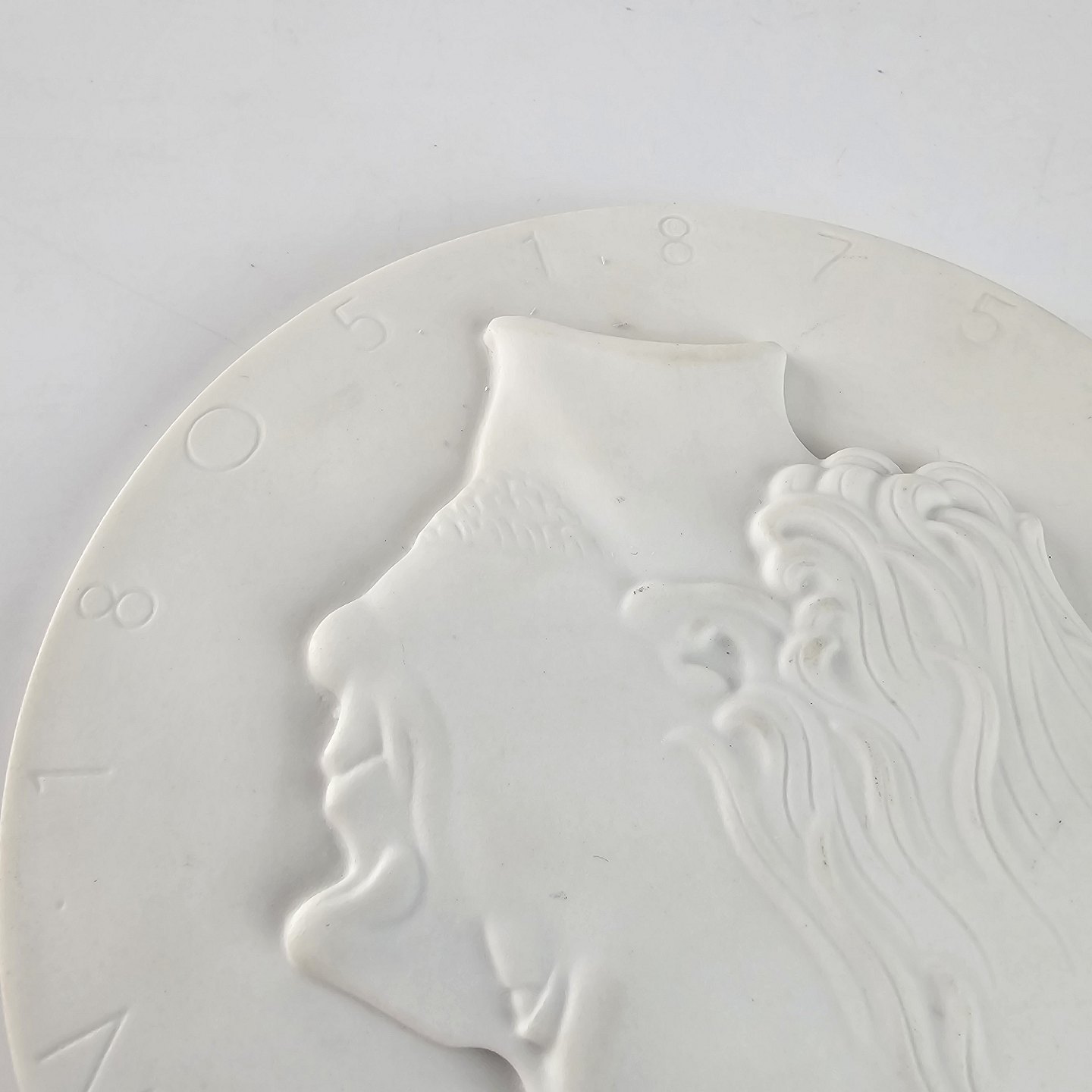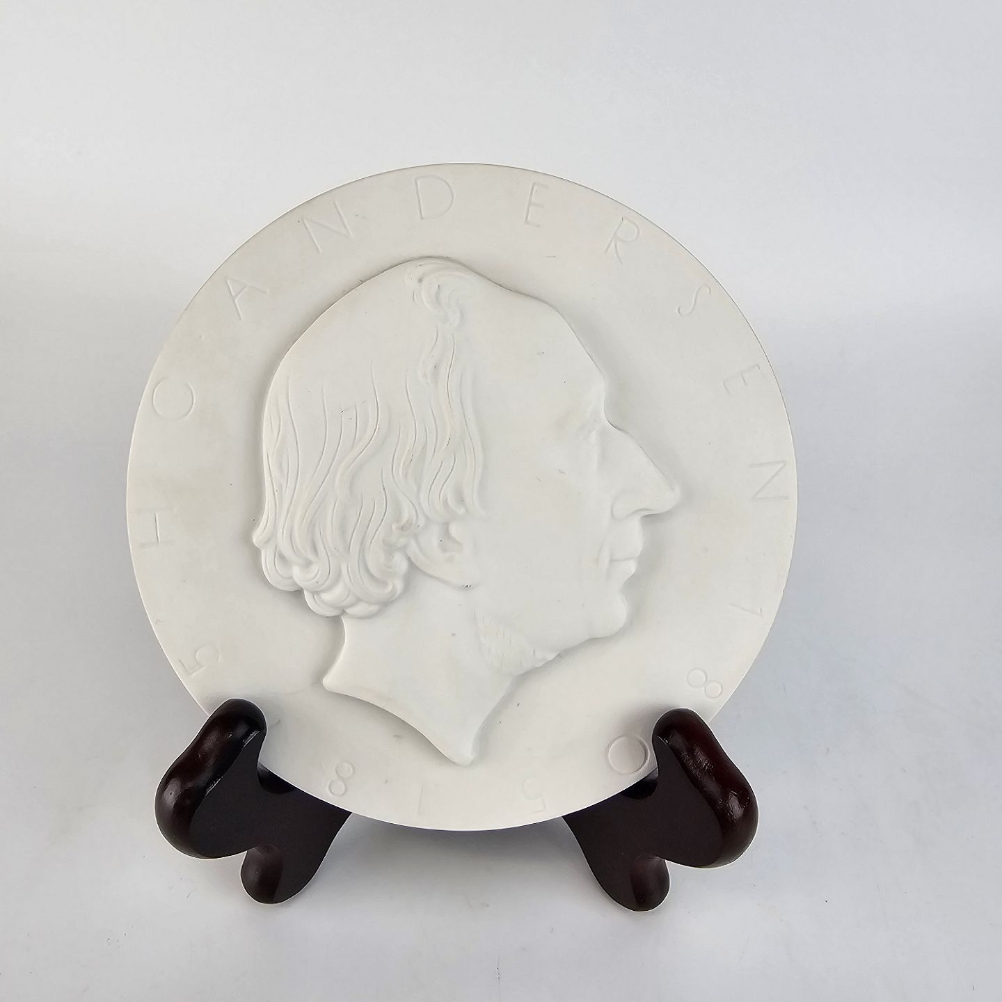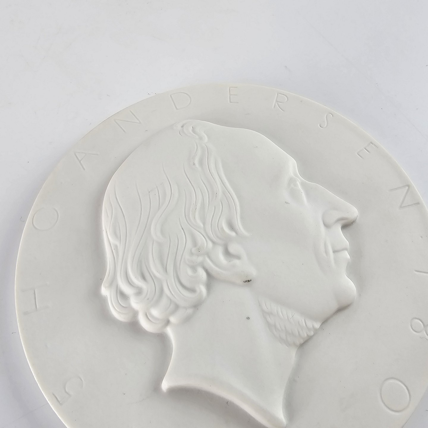 Platte af hvidt porcelæn med et portræt af H. C. Andersen 1805-1875