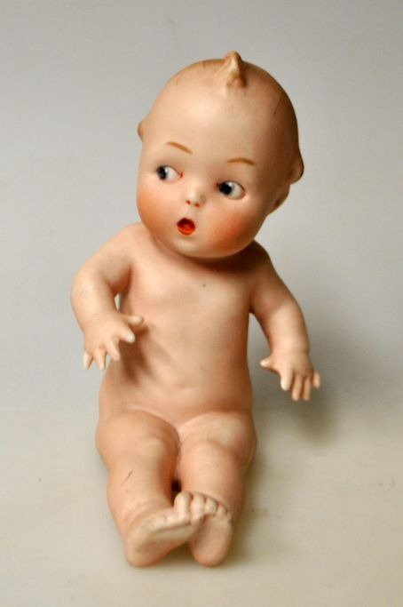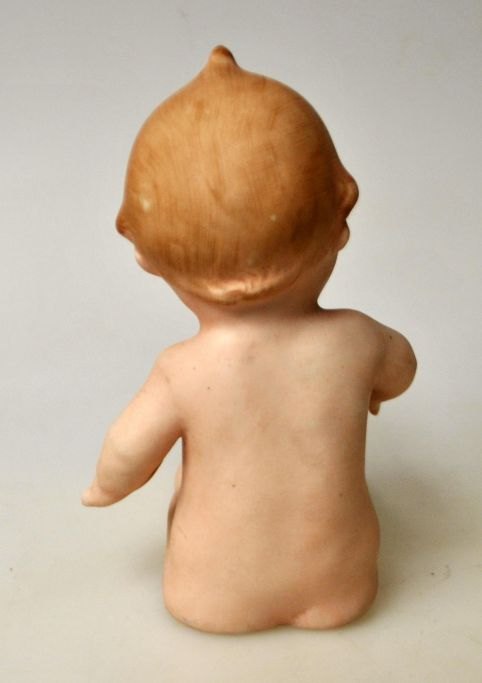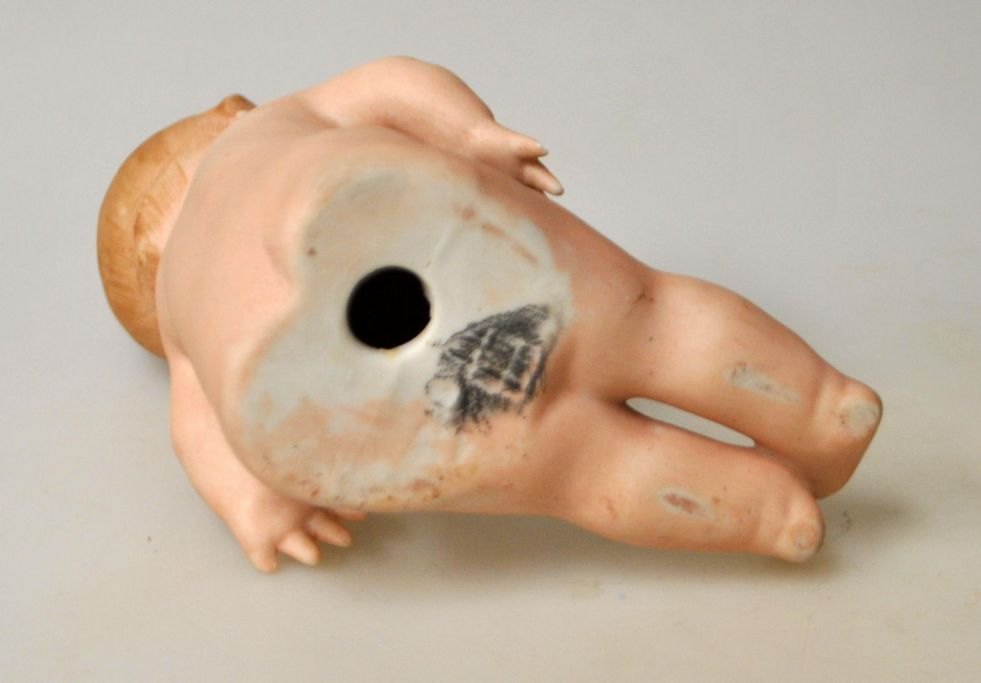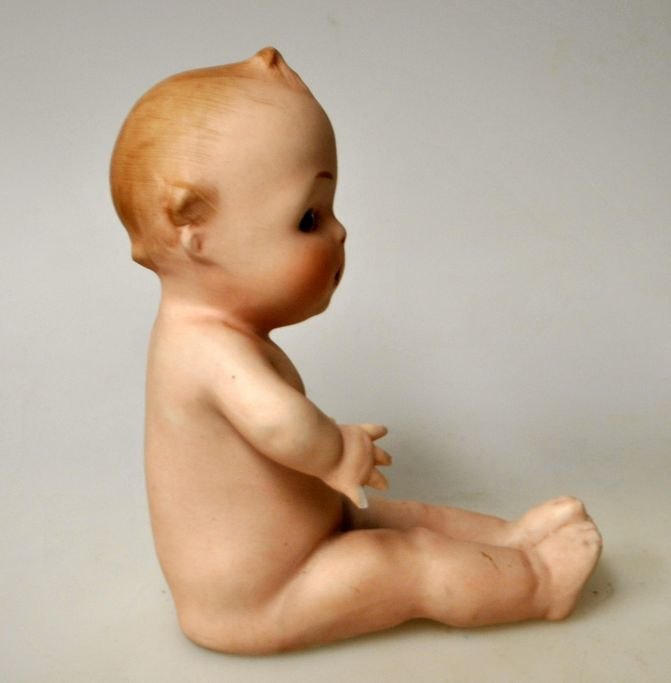 Tysk koldbemalet bisquit figur, 19. årh. Siddende nøgent barn. Stemplet. H.: 12 cm. L.: 9,5 cm.