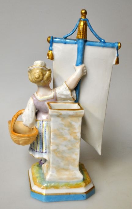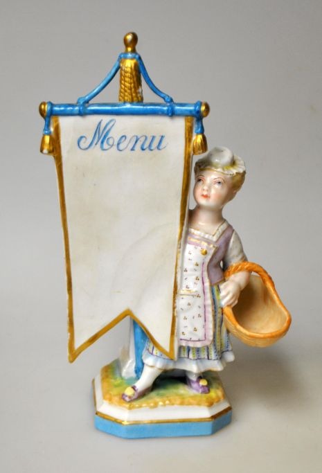 Fransk porcelains figur, 19. Årh. Stående pige med kurv og menu kort. Polykrom dekoration. Stemplet: PB Depose no. 1714. Højde:19 cm.