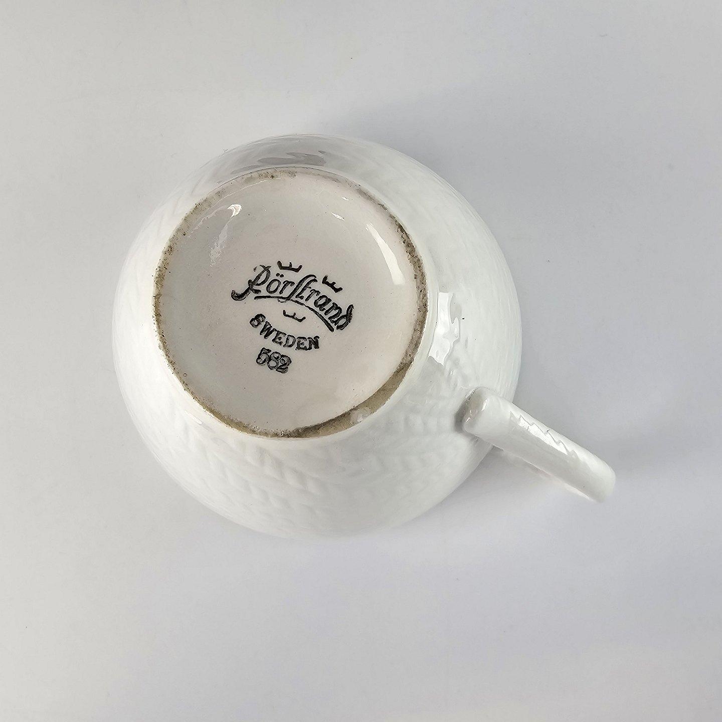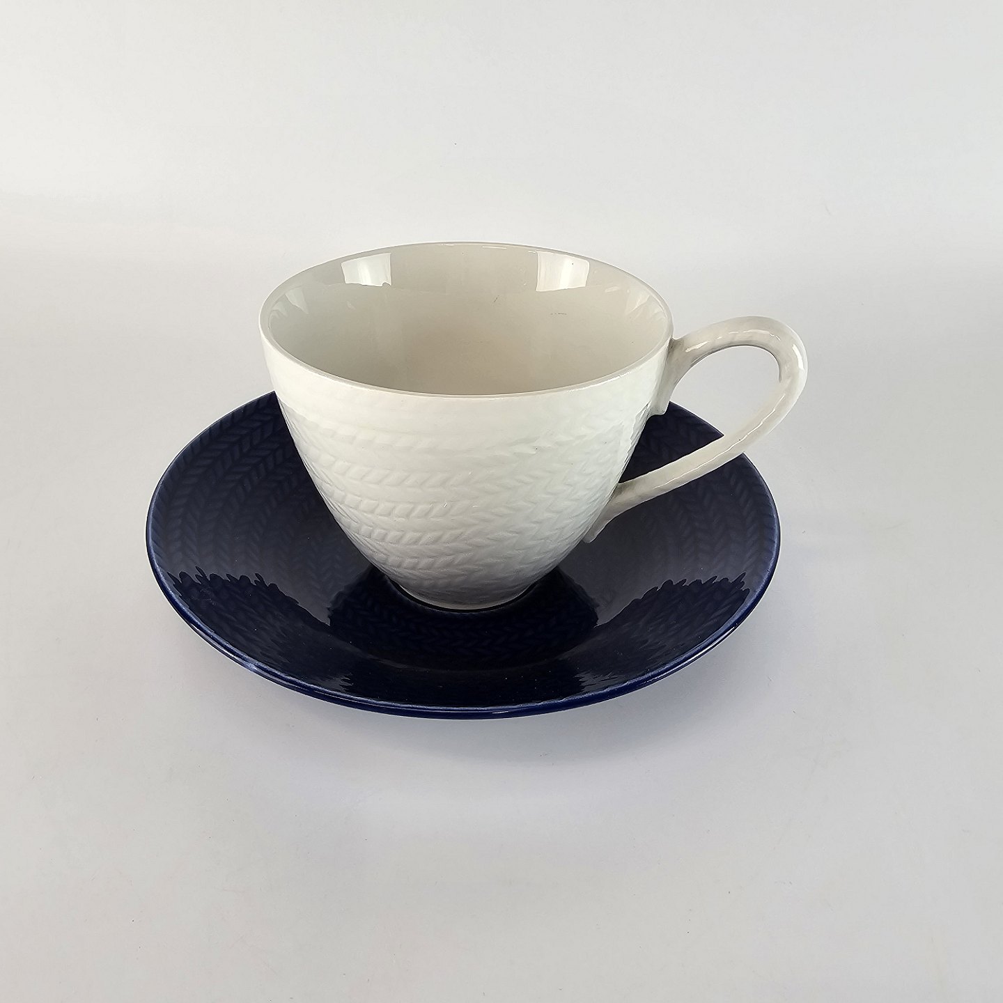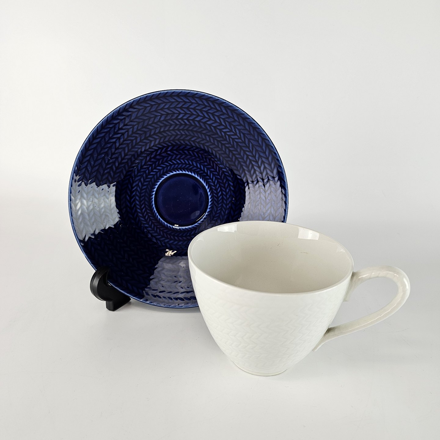 Text available in Danish: Kaffekop og underkop i fajance fra stellet Blå Eld nr. 582