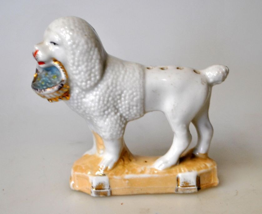 Porcelain figure of poodle dog with basket, 19th century Germany