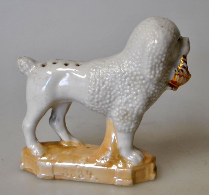 Porcelain figure of poodle dog with basket, 19th century Germany. Gilding on basket and painted. No. 3884. H: 8 cm. L: 8.5 cm.