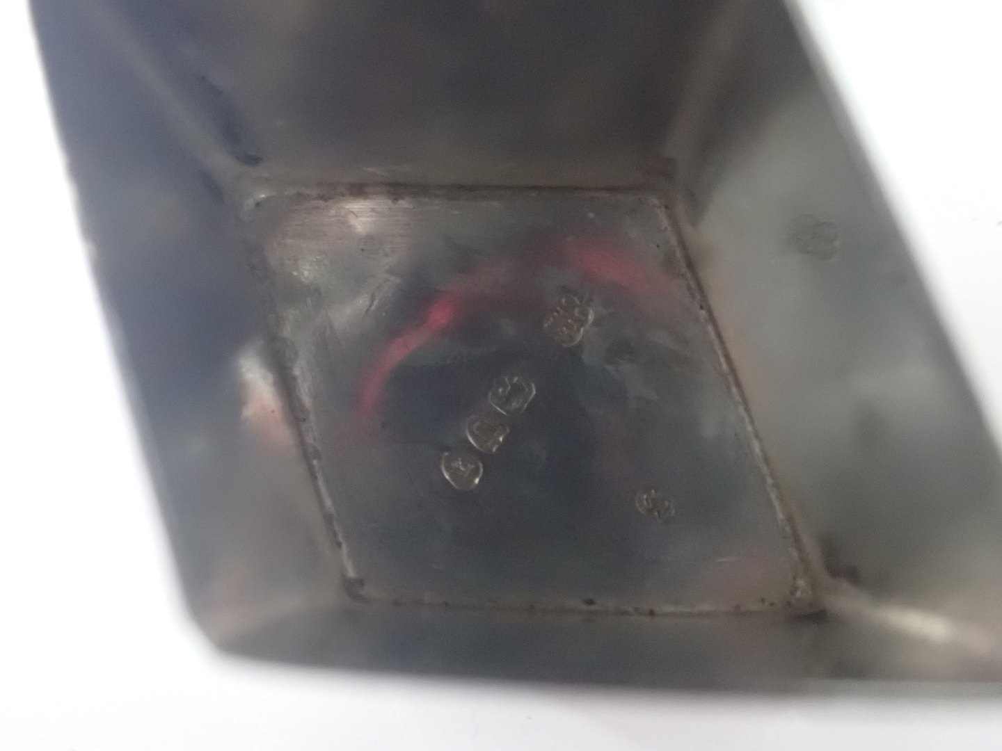 Engelsk sølv tedåse i flot firsidet skævgeometrisk form udført af sølvsmed: Heath & Middelton(1887 - 1909), designet af Christopher Dresser(1834 -1904). Stemplet både i låg og på korpus: JTH over JHM, London år 1895 (U i skjold). # 3. Vægt: 162 gram. Højde: 9 cm. I Flot stand i forhold til alder. Stempler på korpus noget slidt, men helt klare i låg.