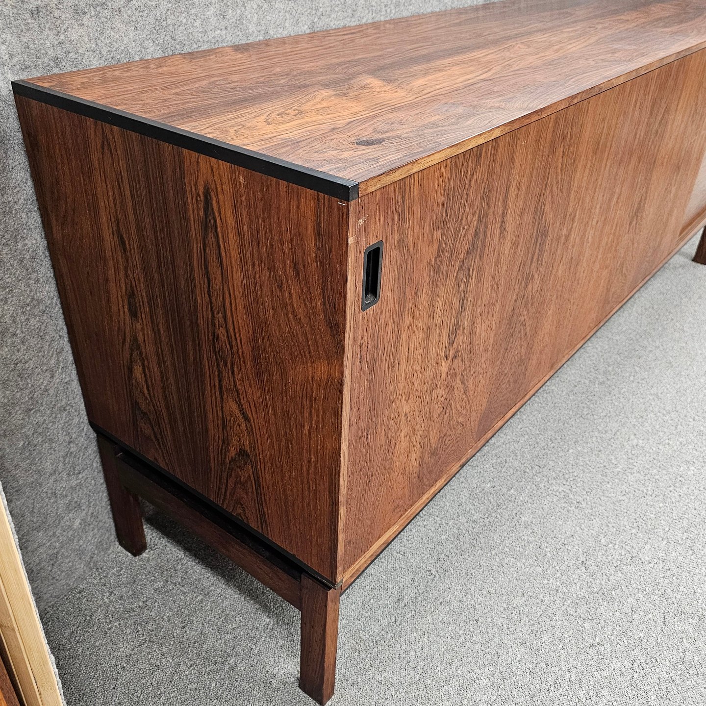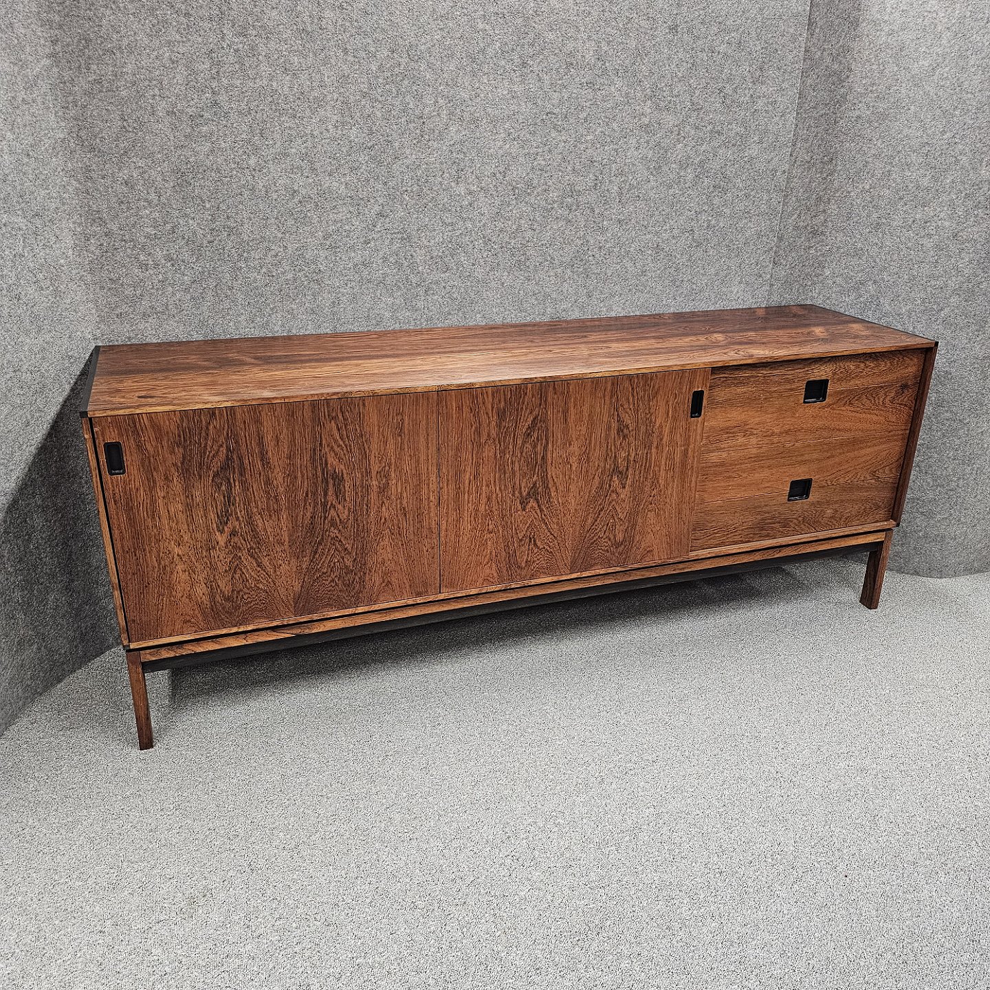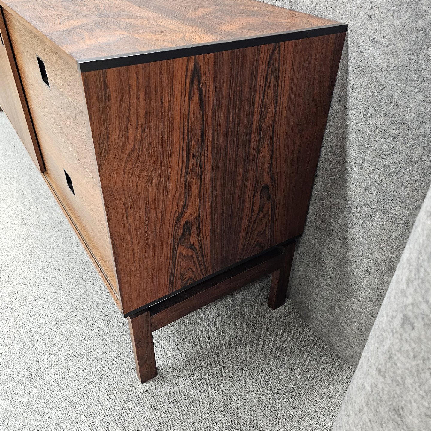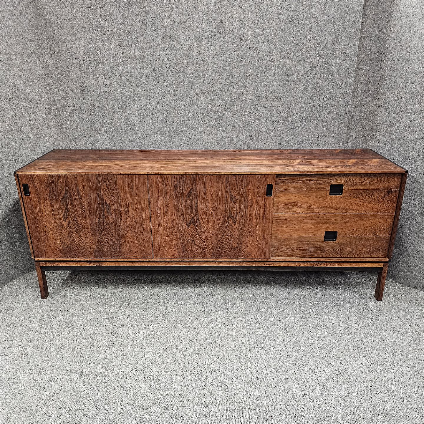 Skænk af palisander, med to skydelåger. Bag den en låg er der 4 skuffer, bag den anden er der hylder.