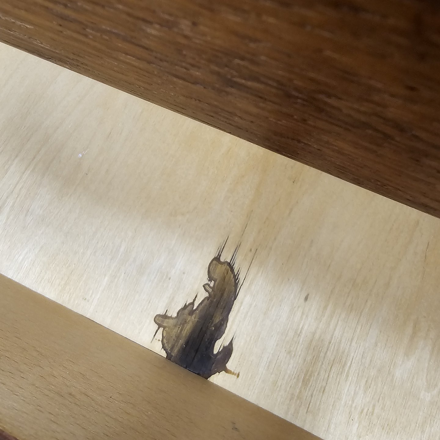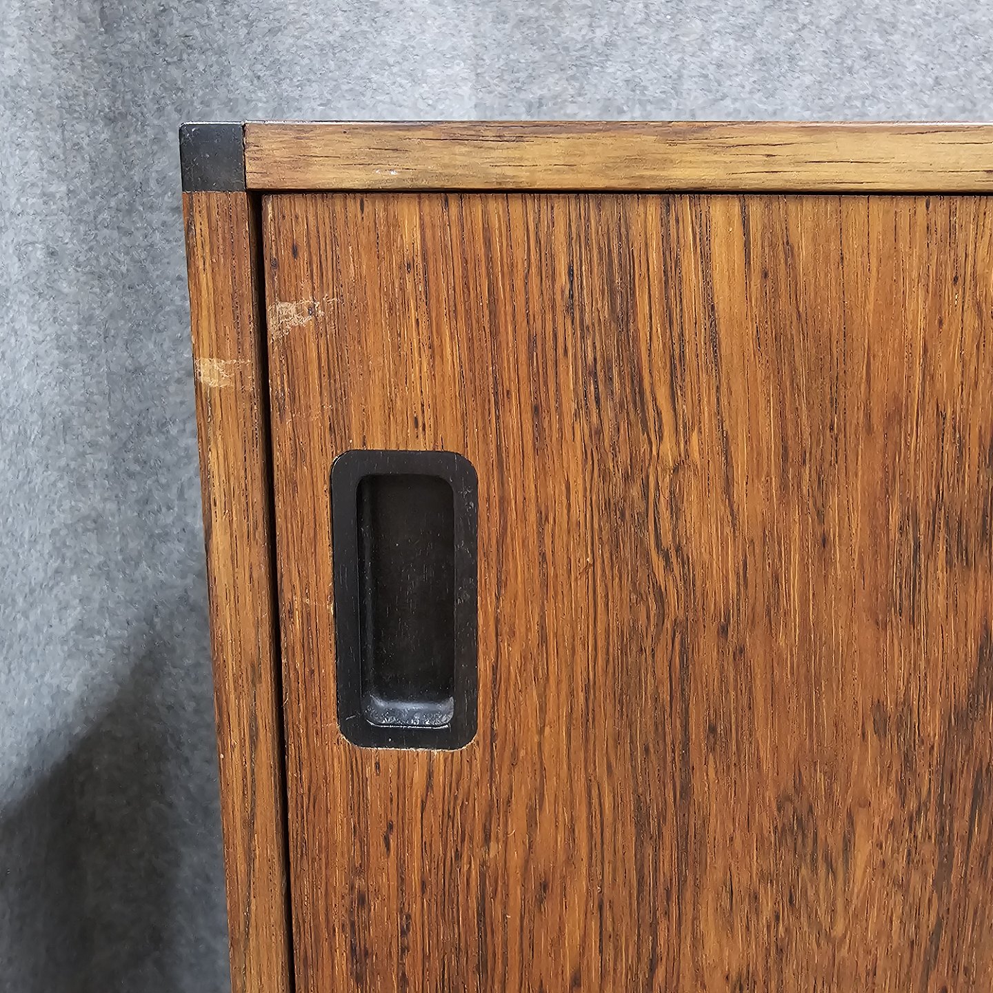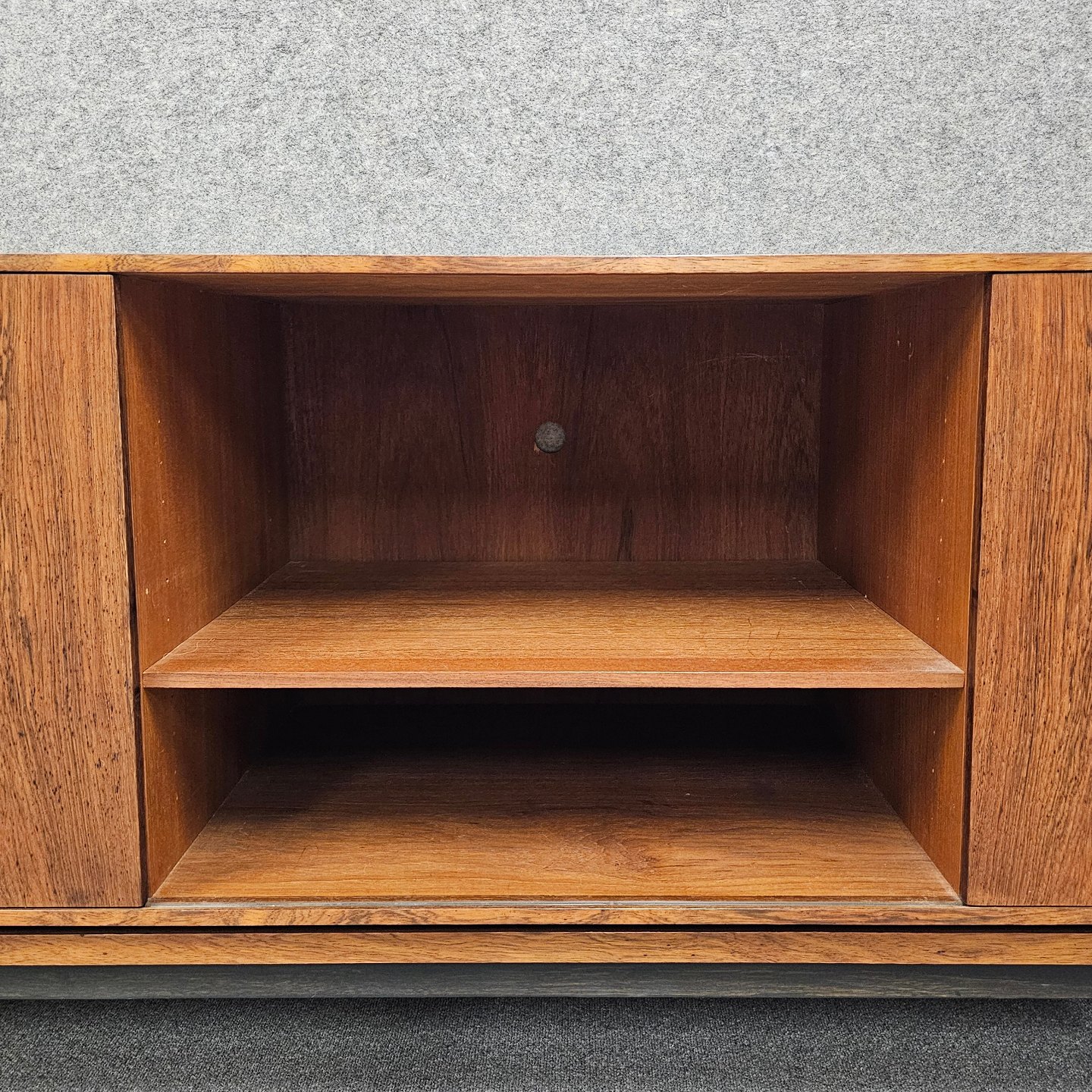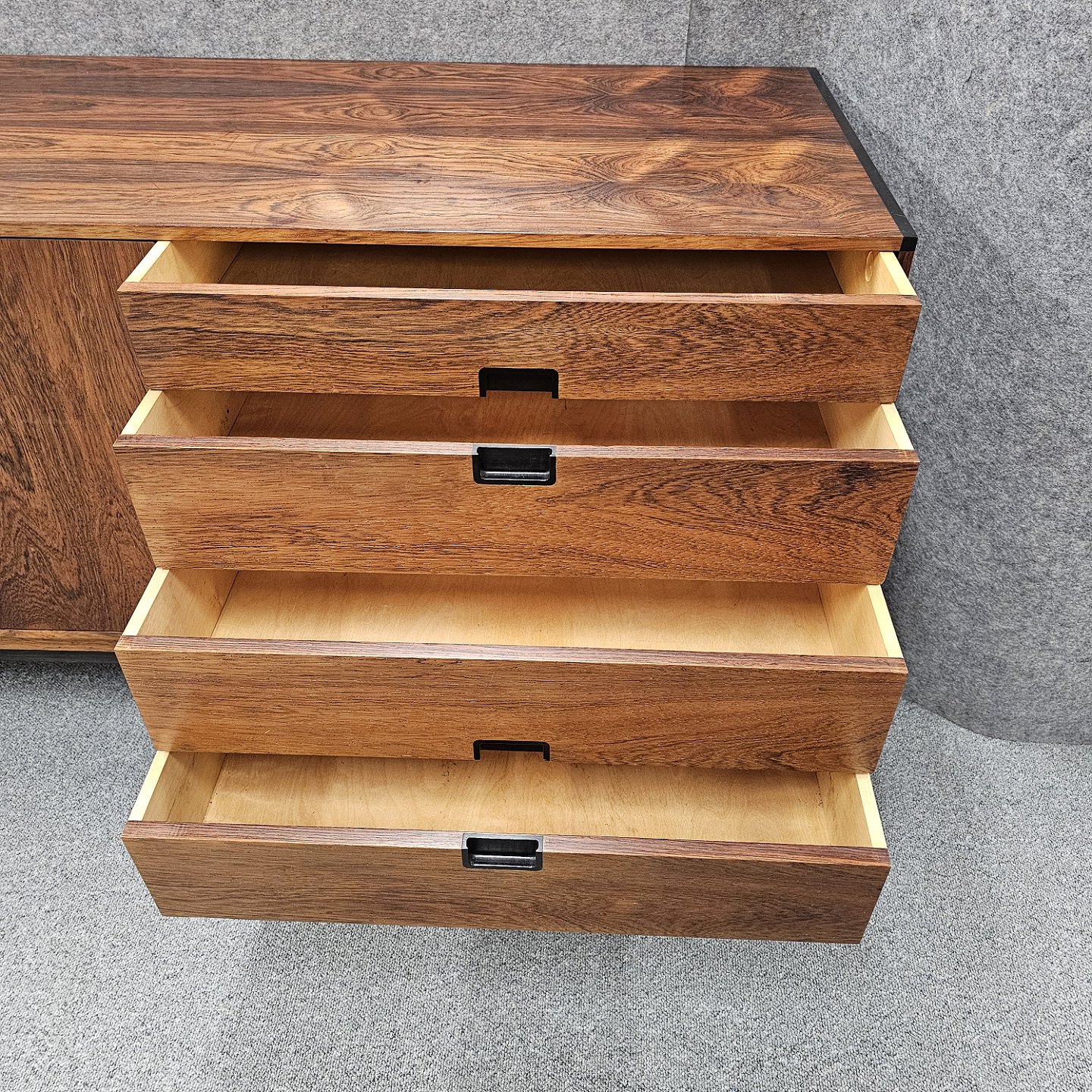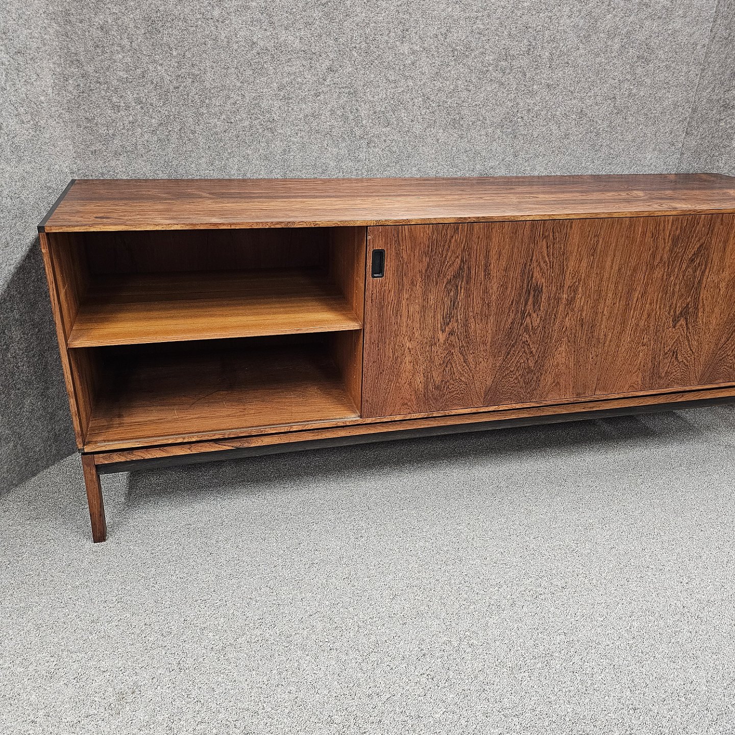 Skænk af palisander, med to skydelåger. Bag den en låg er der 4 skuffer, bag den anden er der hylder.