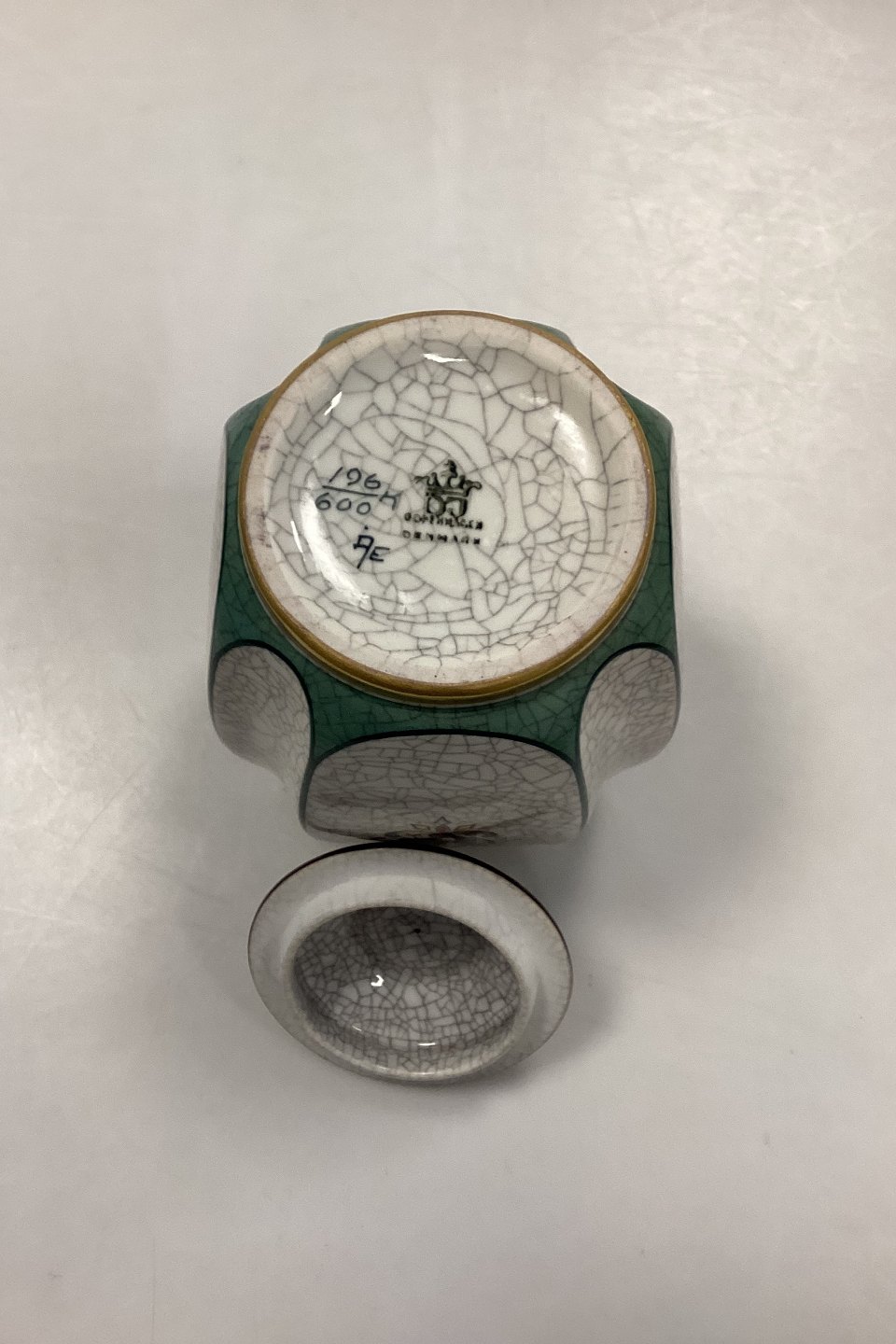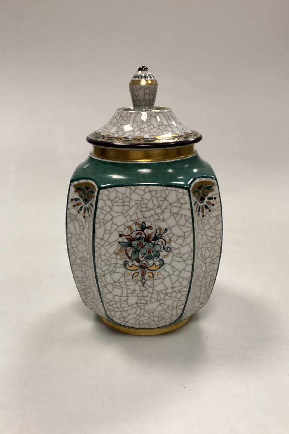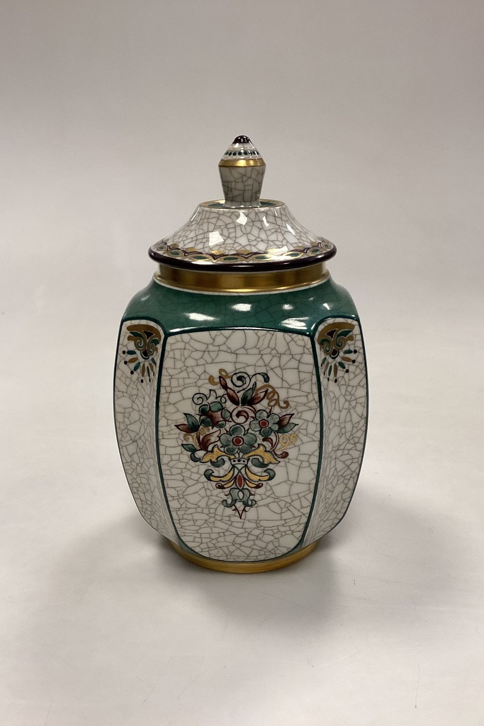 Dahl Jensen Craquelé Lågkrukke No. 196/600. Dekoration i grøn, hvid rød og guld.1. Sortering. Måler 19 cm / 7,48 in.