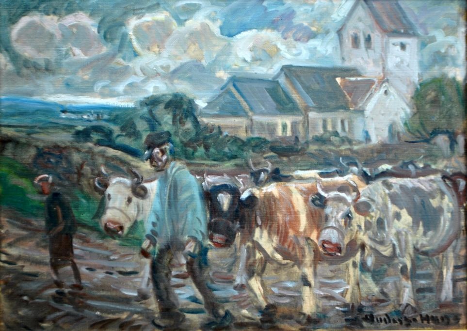Hune, Anders (1894-1968) Denmark: Cows at village church. Oil on canvas. Signed: Anders Hune. 48.5 x 67 cm.