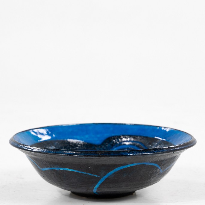 Skål i stentøj med relief i blå glasur. Signeret fra 1963.