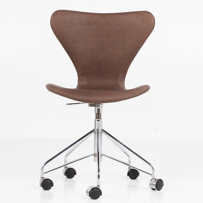 AJ 3117 - 'Seven' office chair in new 'Vitoria' olive tanned aniline leather (Ebody 2122) with steel frame and black plastic wheels.