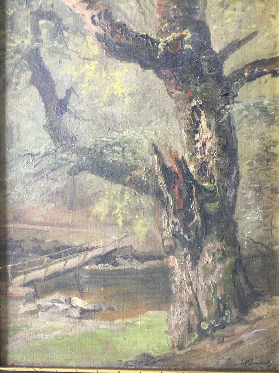 Maleri af Peter Busch - Skovparti med bro over bæk.