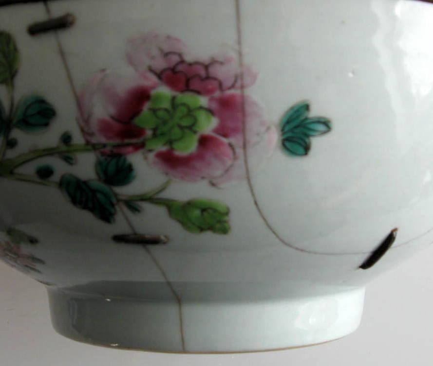 Famille Rose bowle, 19. årh. Kina. Flerfarvet emaljemaleri med strøblomster og kantdekortion. Repareret/klinket med messingkant. H.: 9,5 cm. Dia.: 20,5 cm.