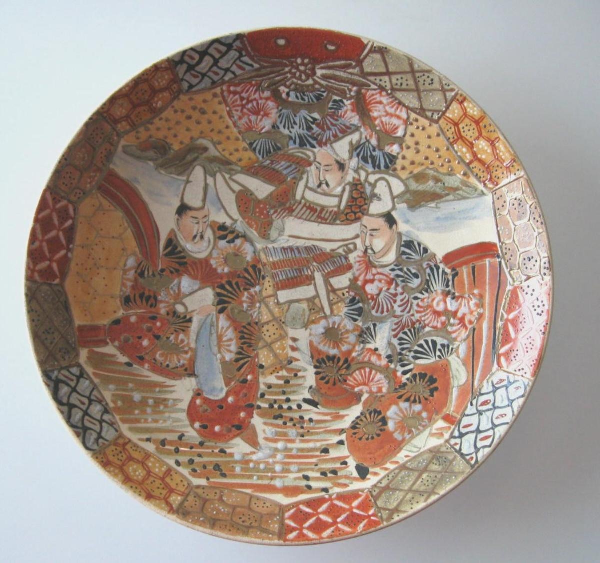 Satsuma tallerken, Meji perioden, Japan, 19. årh. Polykrom dekoreret med tre mænd og guld. Signeret. Dia.: 25 cm.