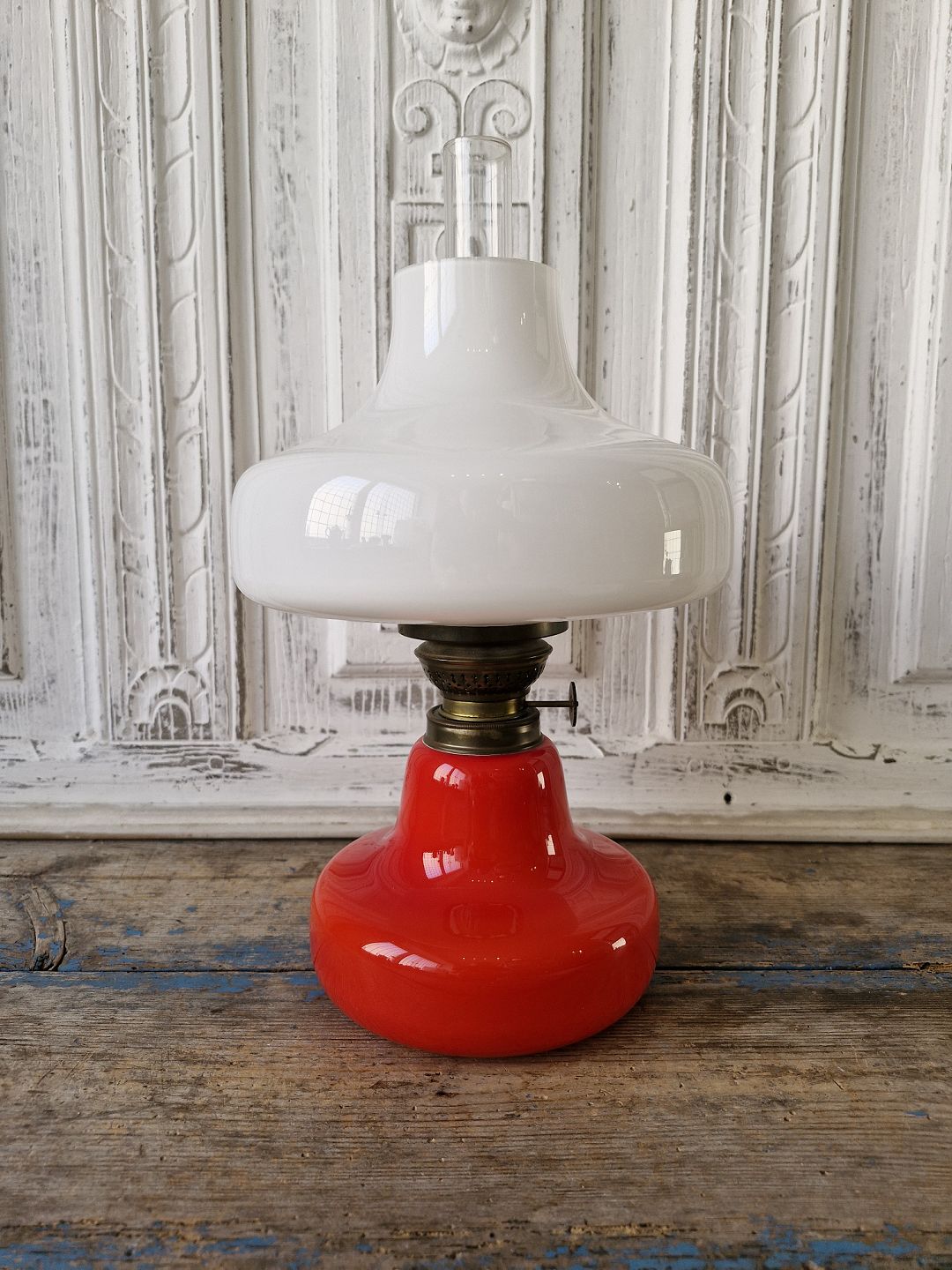 Holmegaard Oline petroleumslampe i rødt glas med hvis skærm i opalglas