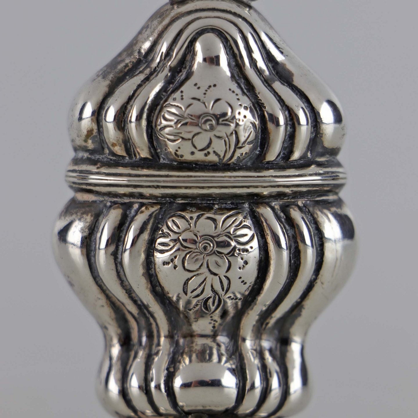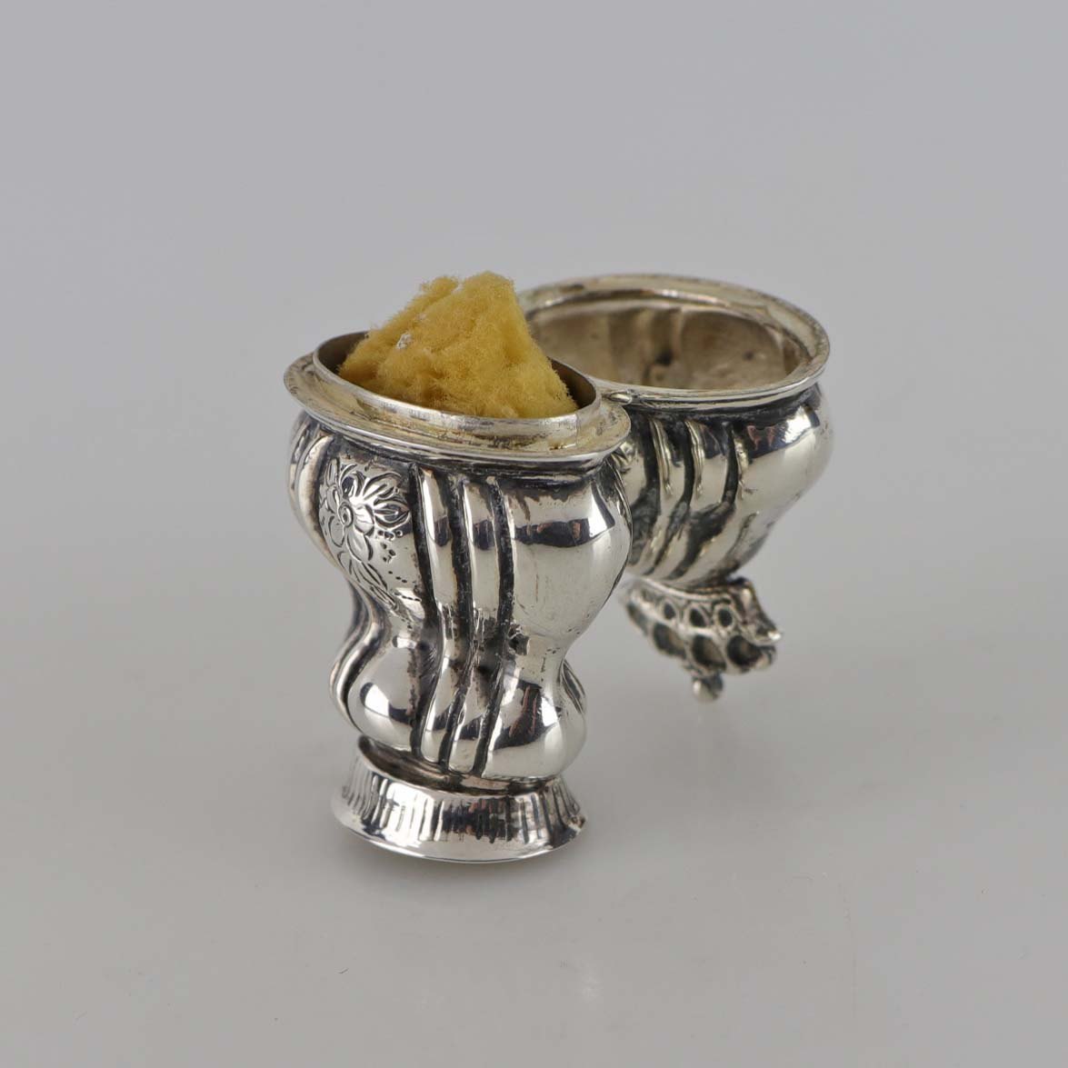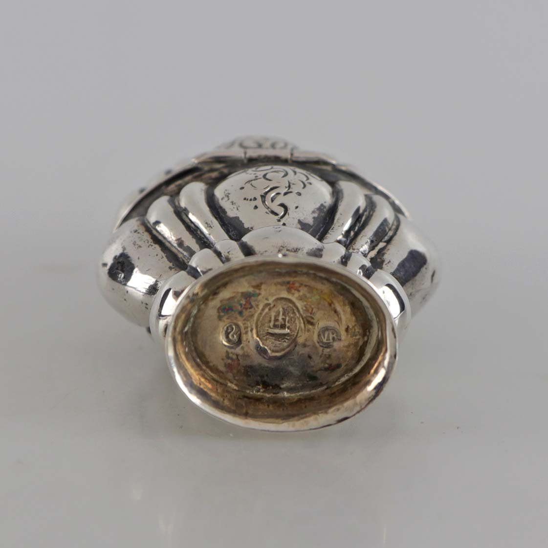 Text available in Danish: Antik hovedvandsæg i sølv med blomstermønster. Ægget indeholder en svamp
