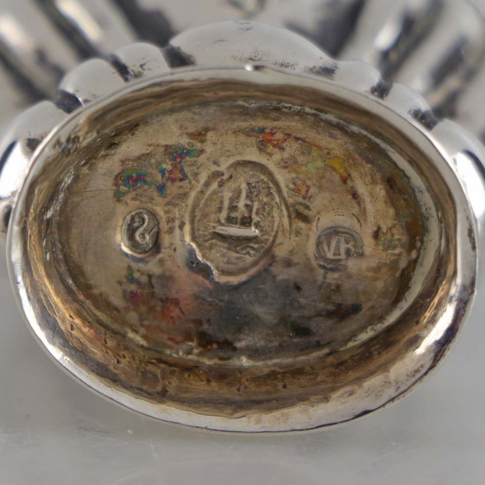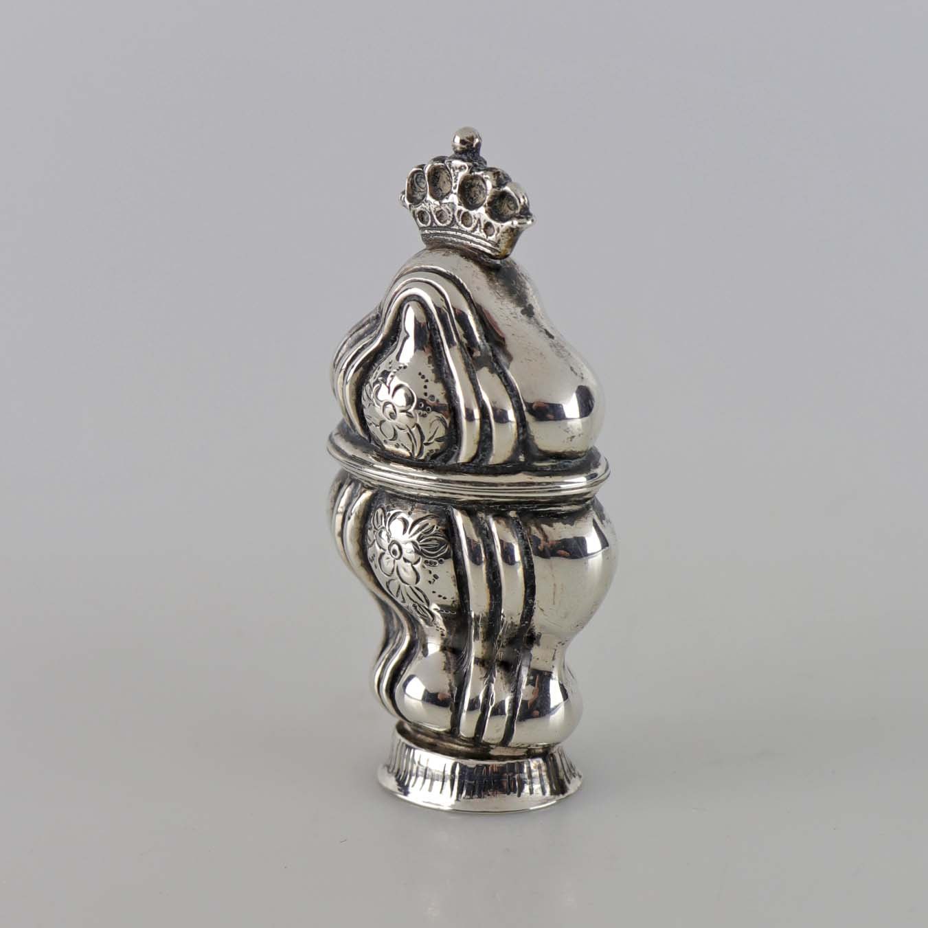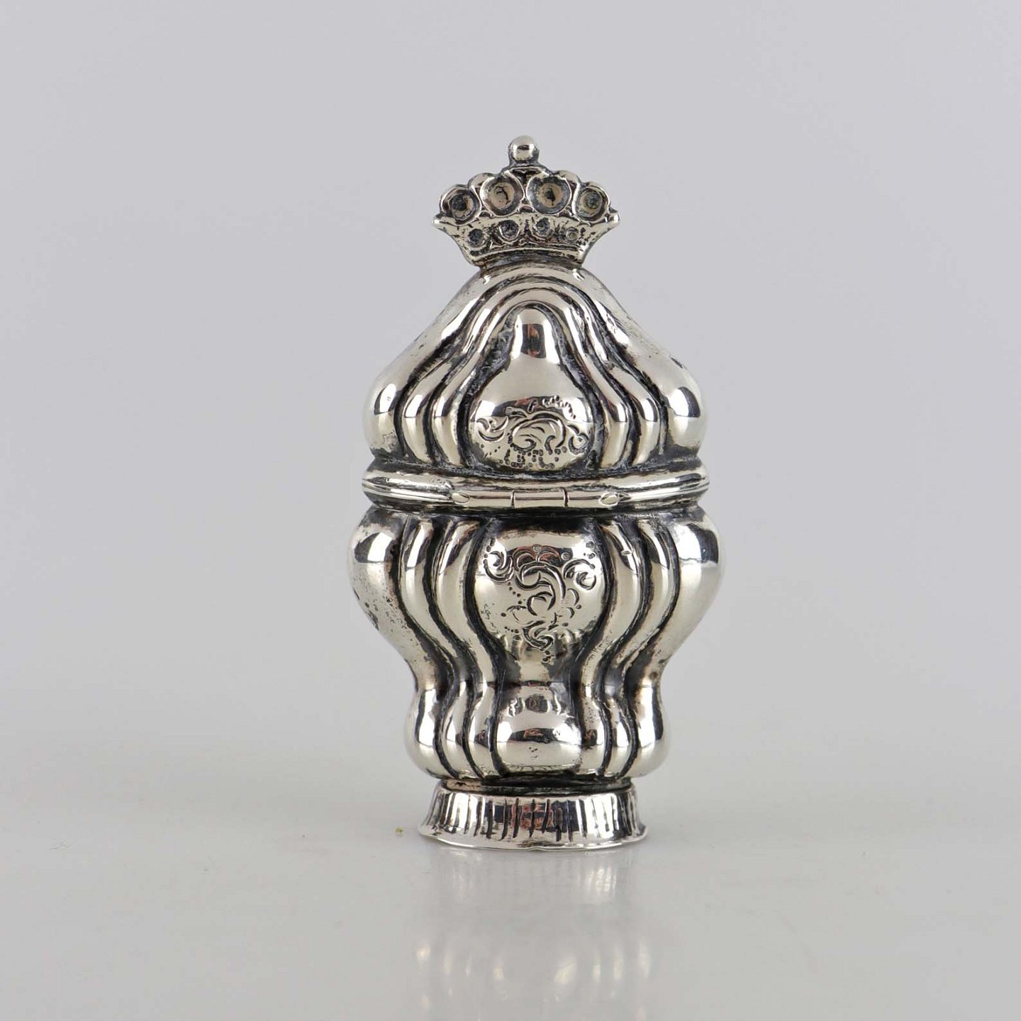 Text available in Danish: Antik hovedvandsæg i sølv med blomstermønster. Ægget indeholder en svamp