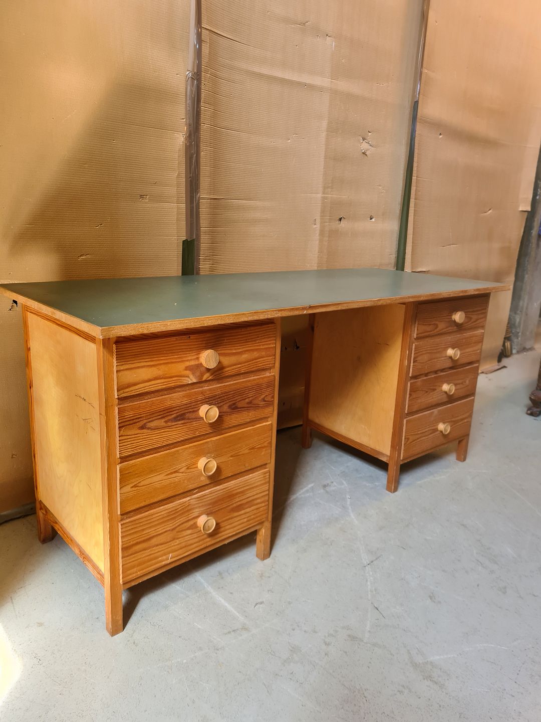 Skrivebord i fyrretræ og krydsfiner med laminat bordplade, fra 1980erne.