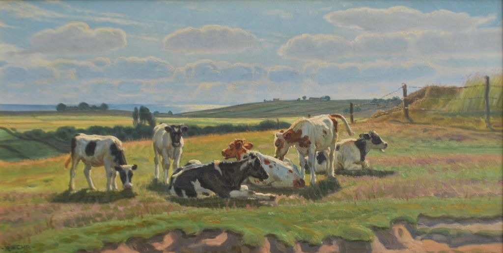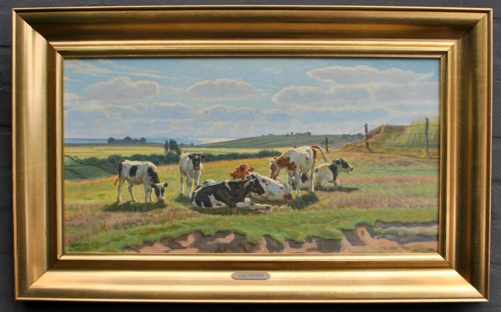 Christiansen, Rasmus (1863 - 1940) Danmark: Køer ved Hjarbæk Fjord. Olie på lærred. Signeret 1926. 32 x 60 cm.