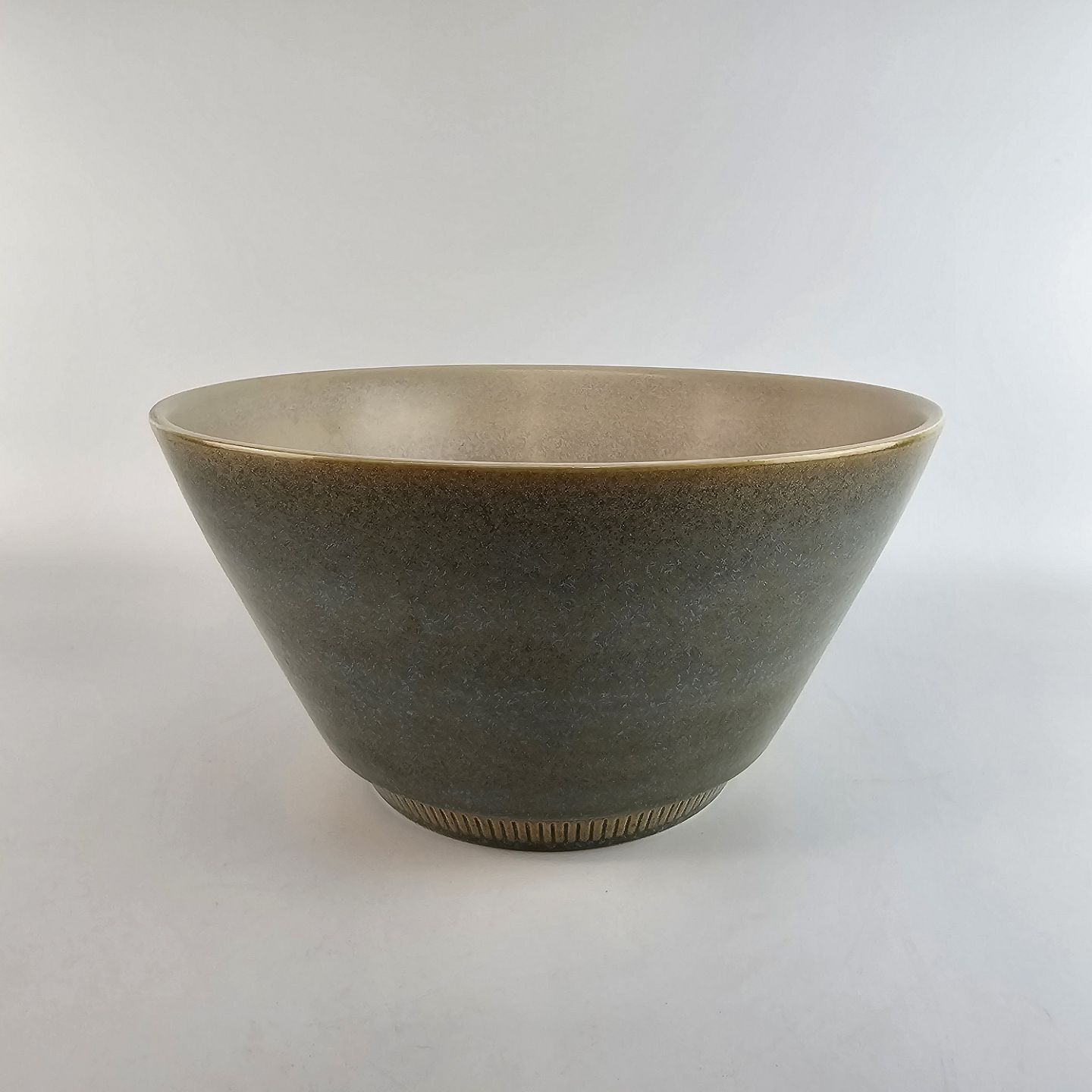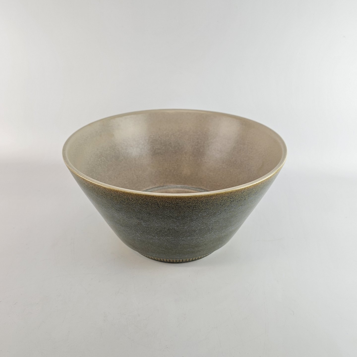 Skål af stentøj og dekoreret med en grønlig nuancefarvet glasering.