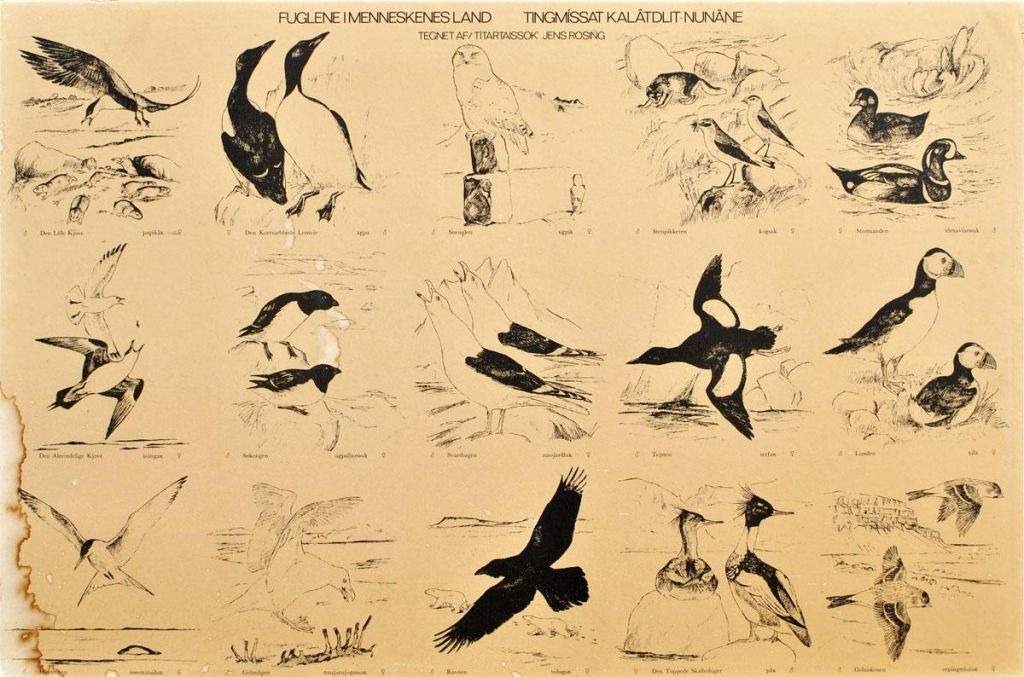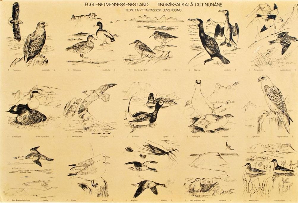 Rosing, Jens (1925 - 2008) Danmark: Fuglene i menneskenes land / Tingmíssat Kalâtdlit-Nunane. Plakater opklæbet på plade. 62 x 93 cm. 2 stk.