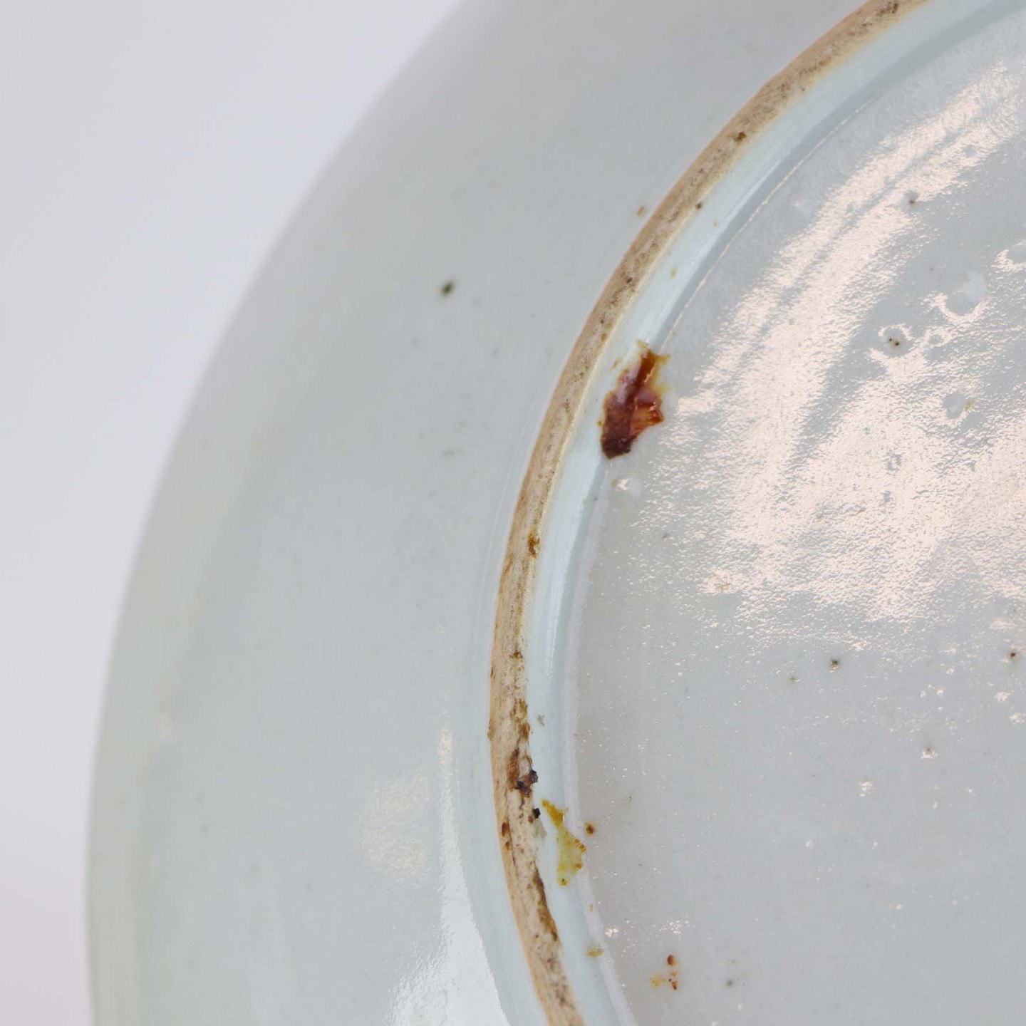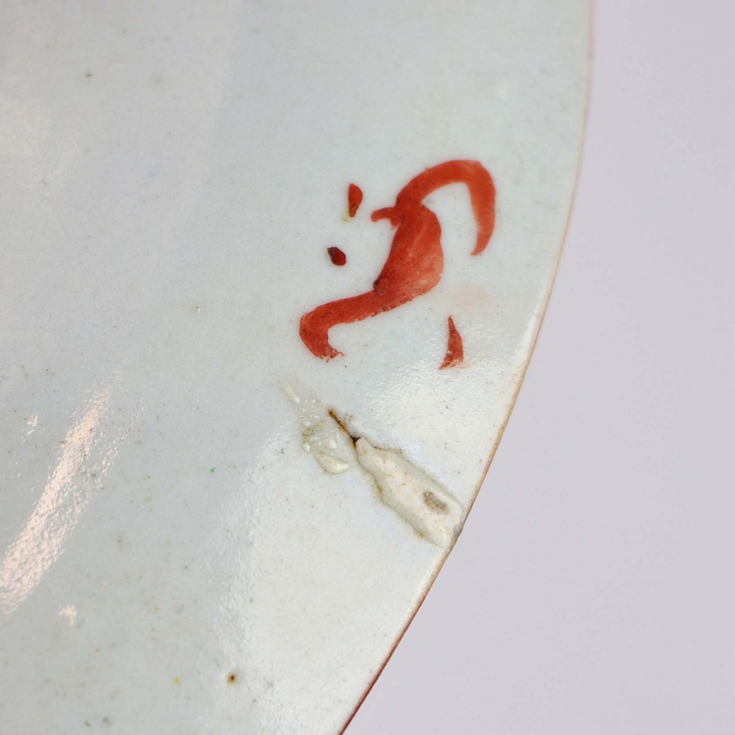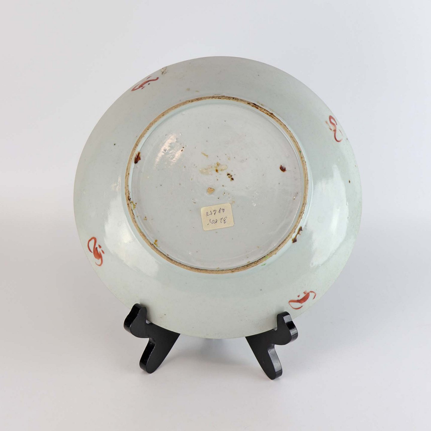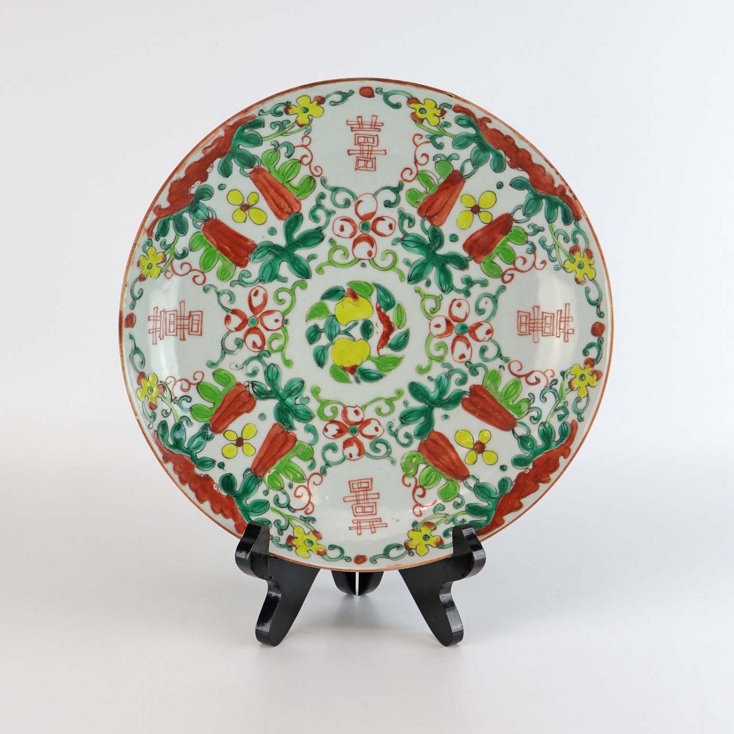 Rundt fad i porcelæn med kinesiske frugt- og blomstermotiver samt skrift dekoration. Fra 1700 tallet