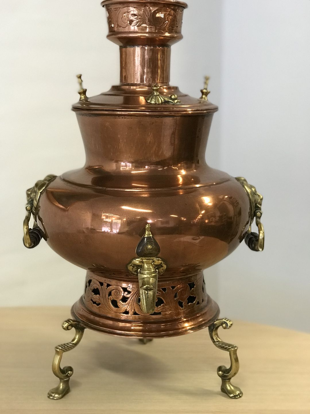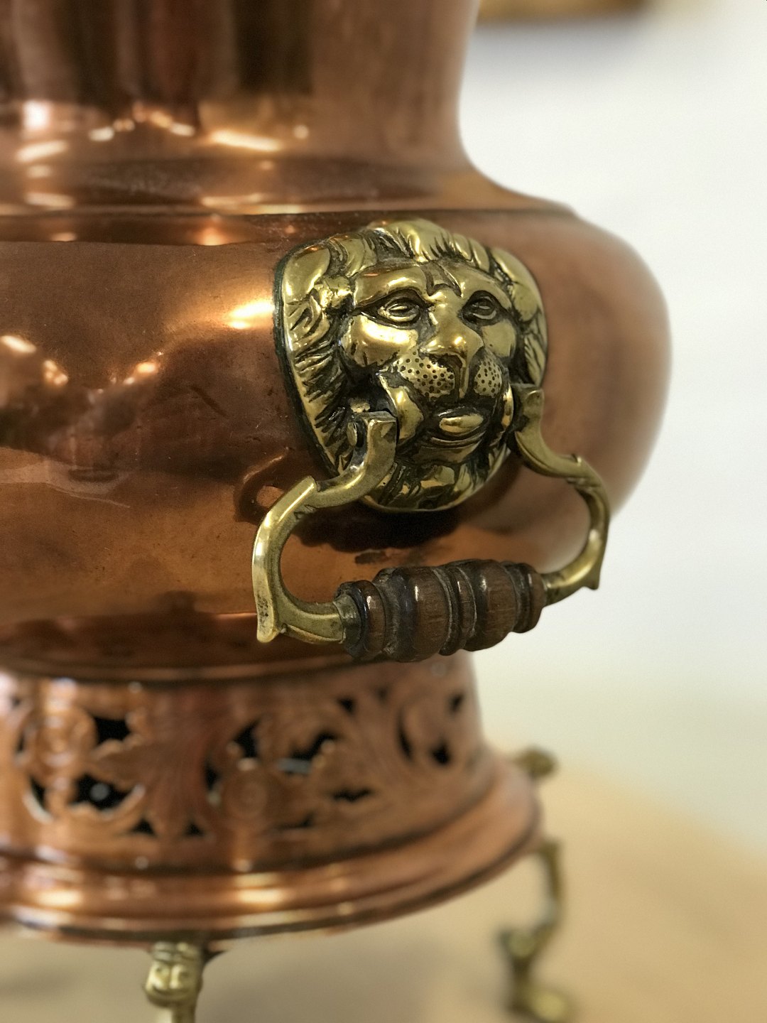 Rokoko temaskine samovar i kobber og messing med træ hanke og træ hane. Stemplet SH 1770. Højde 41 cm.
