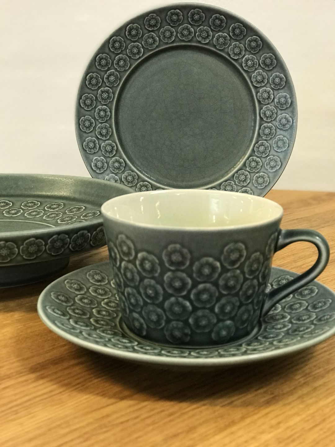 Azur kop, kagetallerkener og lille opsats. Design Jens Quistgaard for Kronjyden.