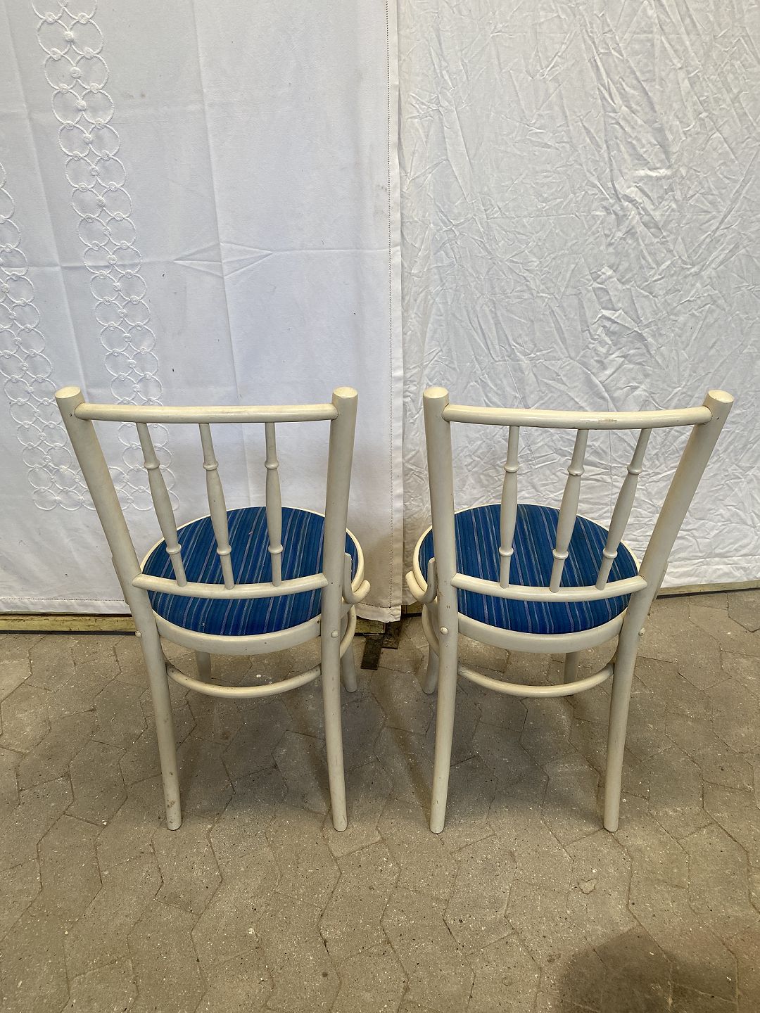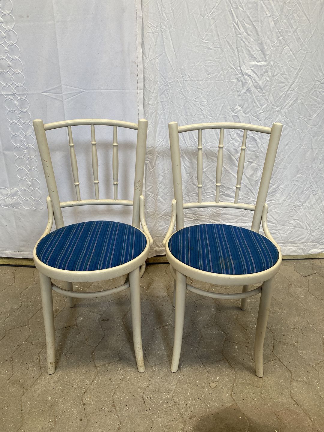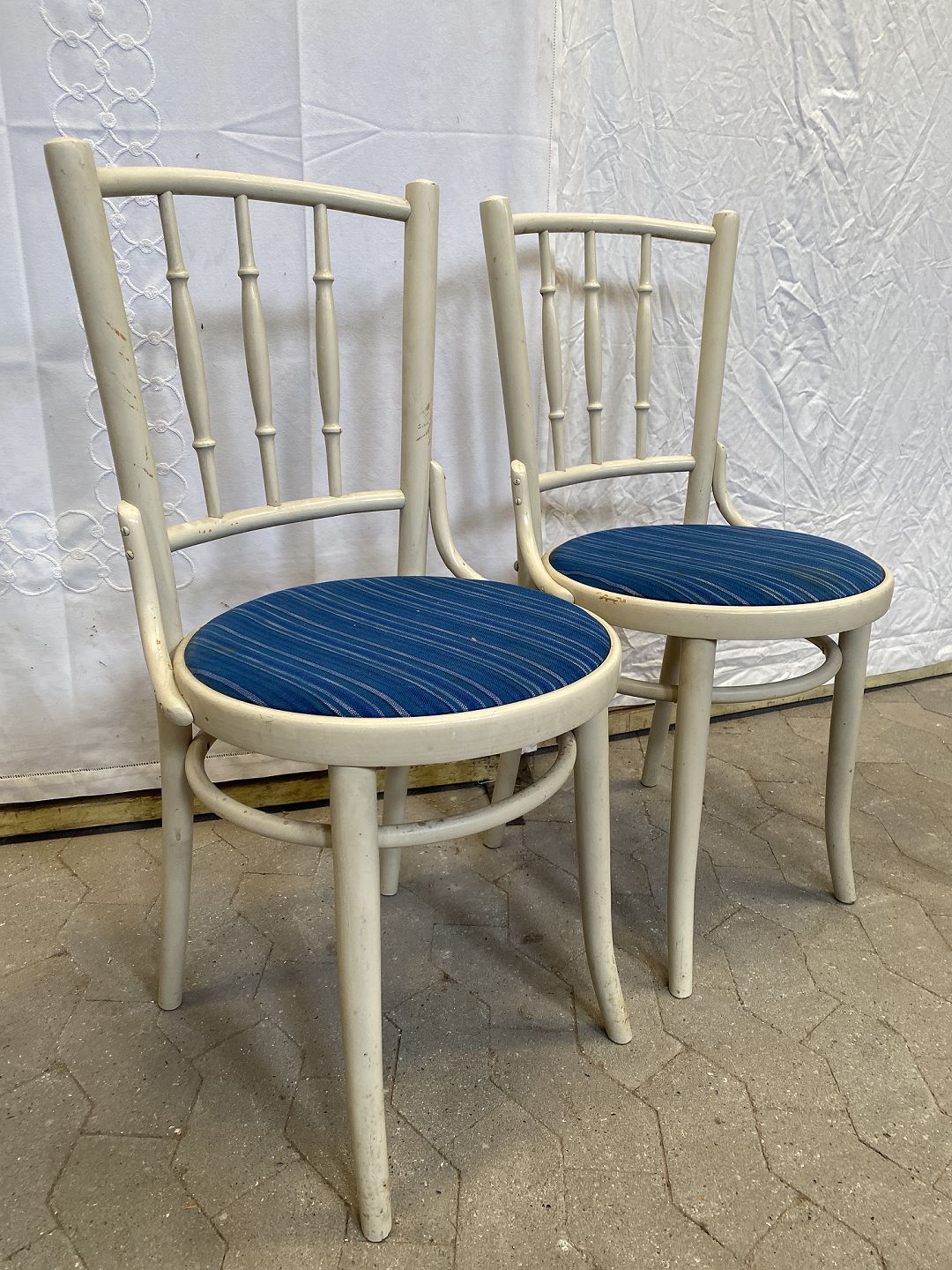 2 hvidmalede stole med blåt betræk.