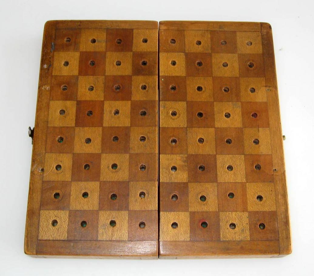 Transportabelt skakspil,ca. 1900. Med brikker i ben - hvide og røde. Æske i frugttræ. 12,5 x 12,5 cm.