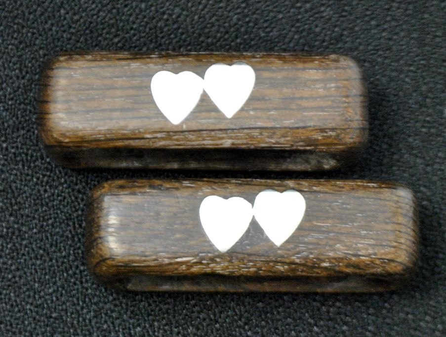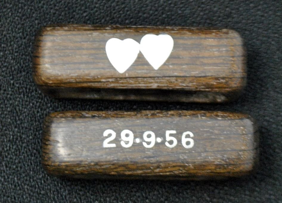 Et sæt servietringe i moseeg med sølvindlægninger, 1956, Danmark. Med to hjerter og datoen: 29-9-56 i sølv. H: 2 cm. B: 6,5 cm. D: 2,5 cm.