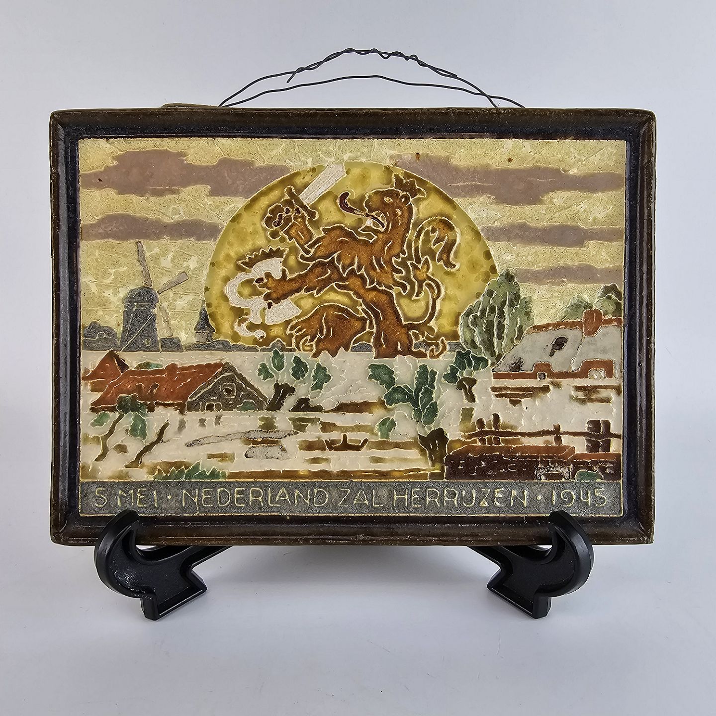 Relief på flise. Mindeplatte med teksten 5 mei, nederland zal herijzen 1945 (5 maj, Holland vil rejse sig igen, 1945)