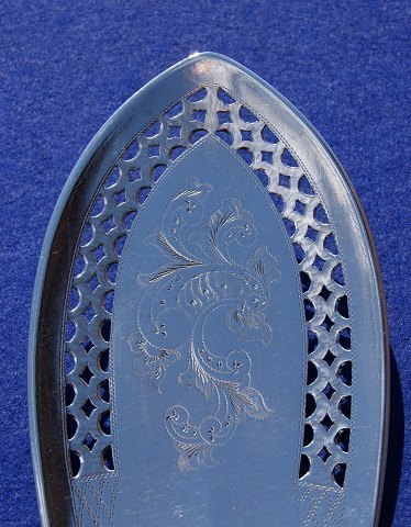 Fiskespade eller serveringsspade fra år 1857 med ciseleringer på serveringsdel og i pæn, brugt stand.