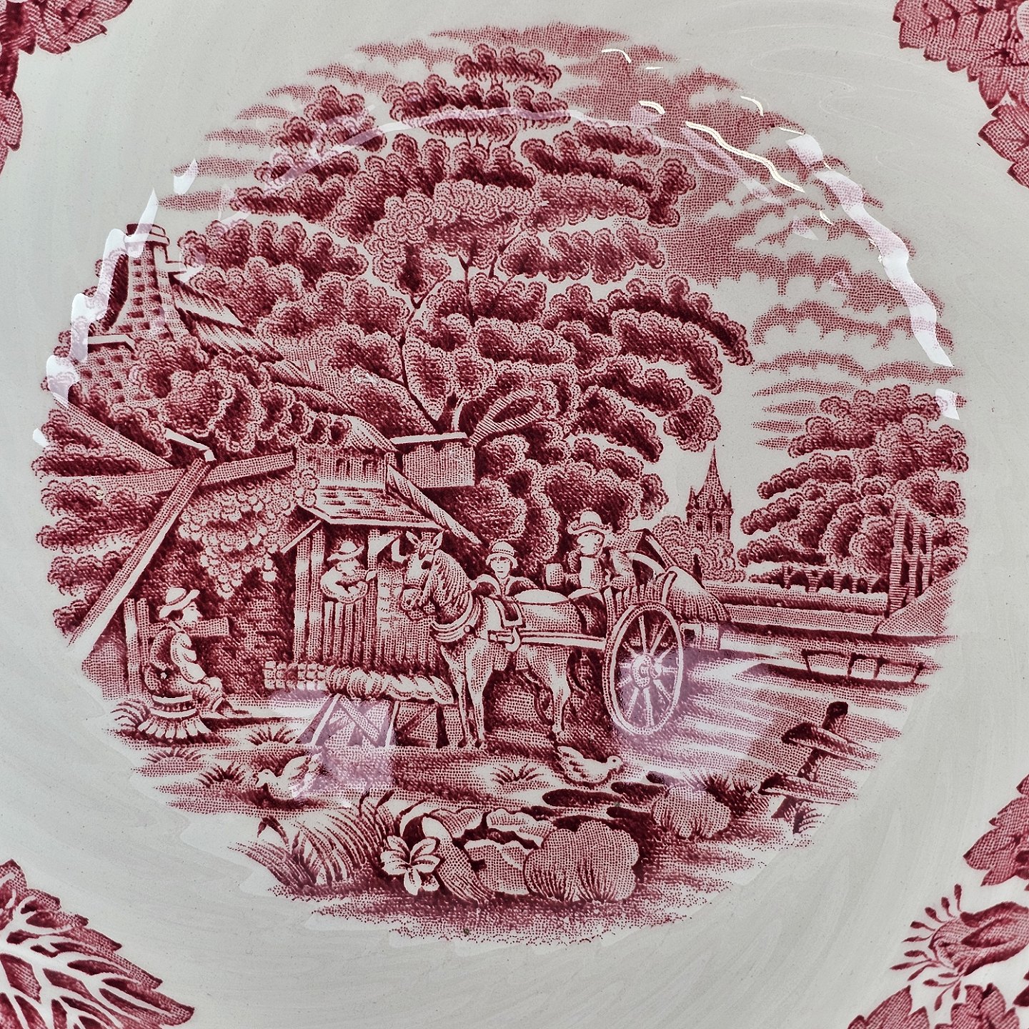 Rød Paris er af engelsk fajance dekoreret med forskellige landskaber og blomster i kanten, alt i forskellige røde nuancer