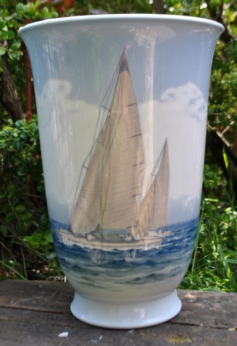 Royal Copenhagen gulvvase i porcelæn, 2821/3558, 20. årh. København, Danmark. Håndmalede motiver med sejlbåde på Sundet. Stemplet. Design: Richard Bøcher. B. H: 34 cm. Dia.: 23,5 cm.