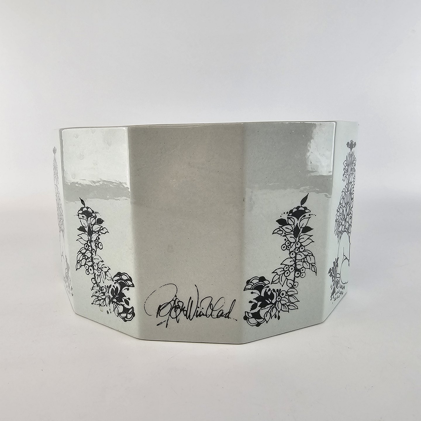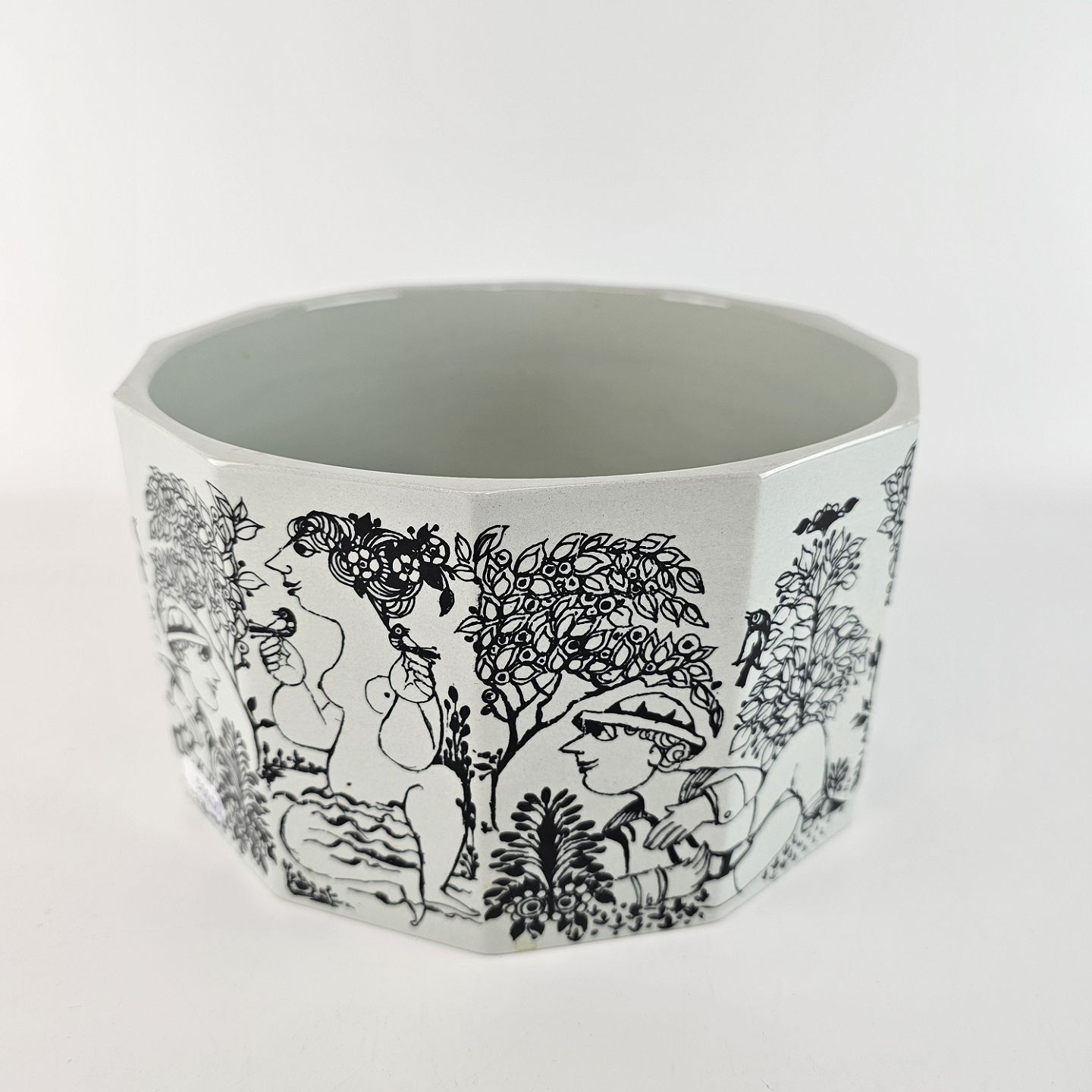 Urtepotteskjuler eller skål af keramik med de klassiske sort/hvide motiver. Denne er af en kvinde som bader og mænd som kigger på.