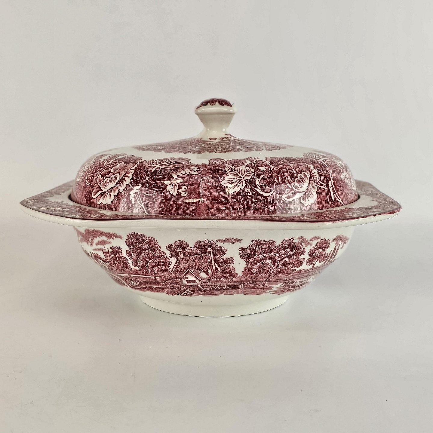 Rød Paris er af engelsk fajance dekoreret med forskellige landskaber og blomster i kanten, alt i forskellige røde nuancer