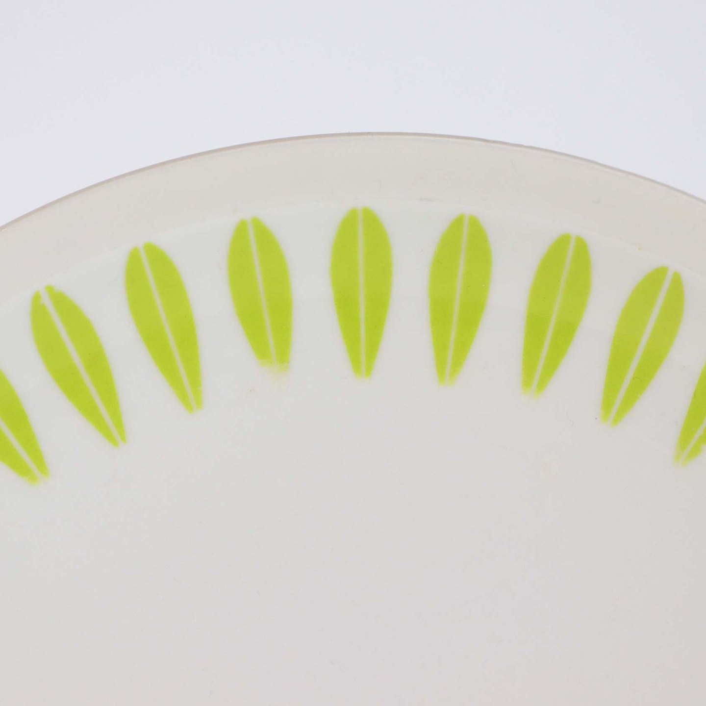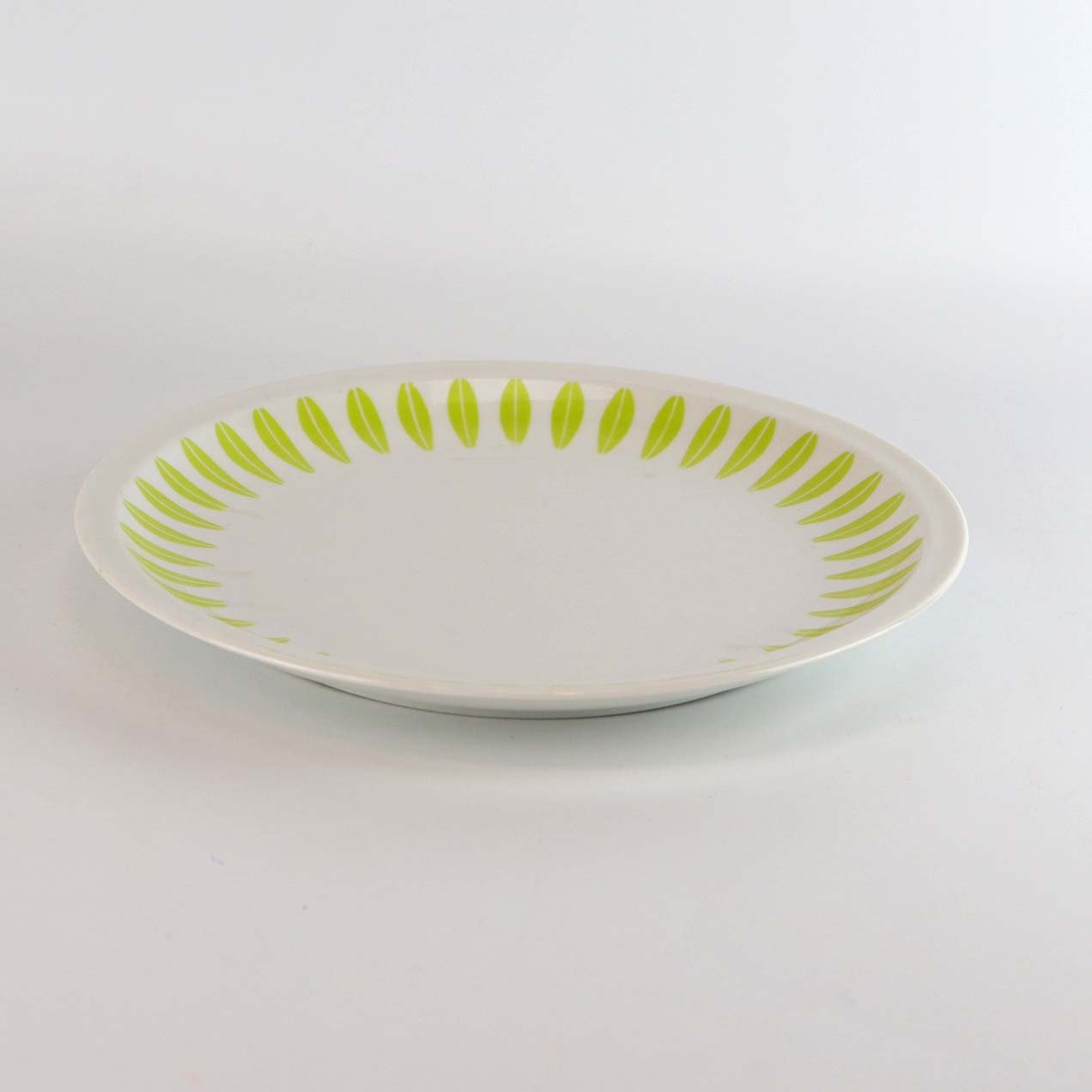 Service i glat hvidt porcelæn, som er påført en cirkel af lotusblade. Stellet er produceret i flere farver