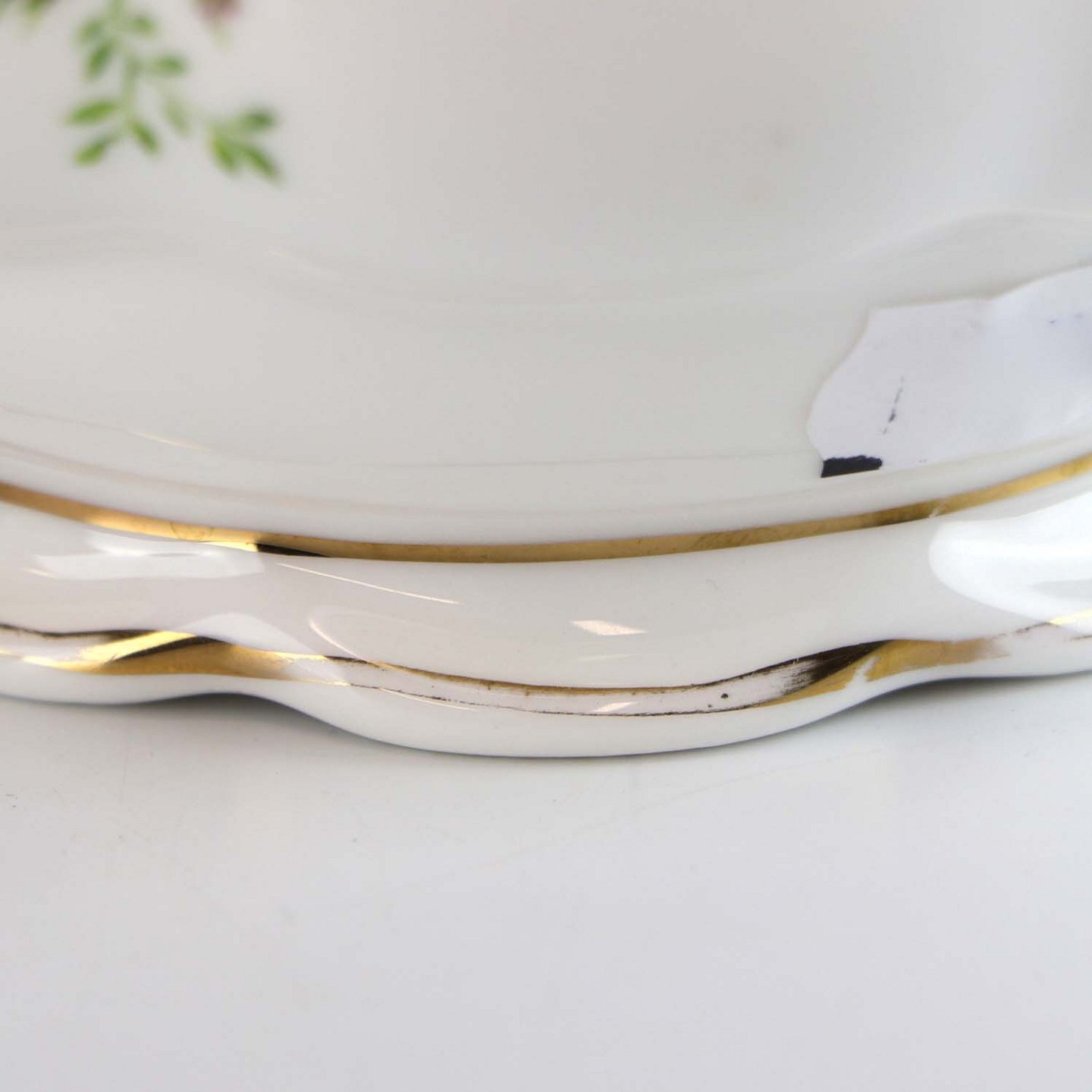 Service i glat hvidt porcelæn med motiv af farverige roser. Topkanten har en let bølget form belagt med gylden dekoration.