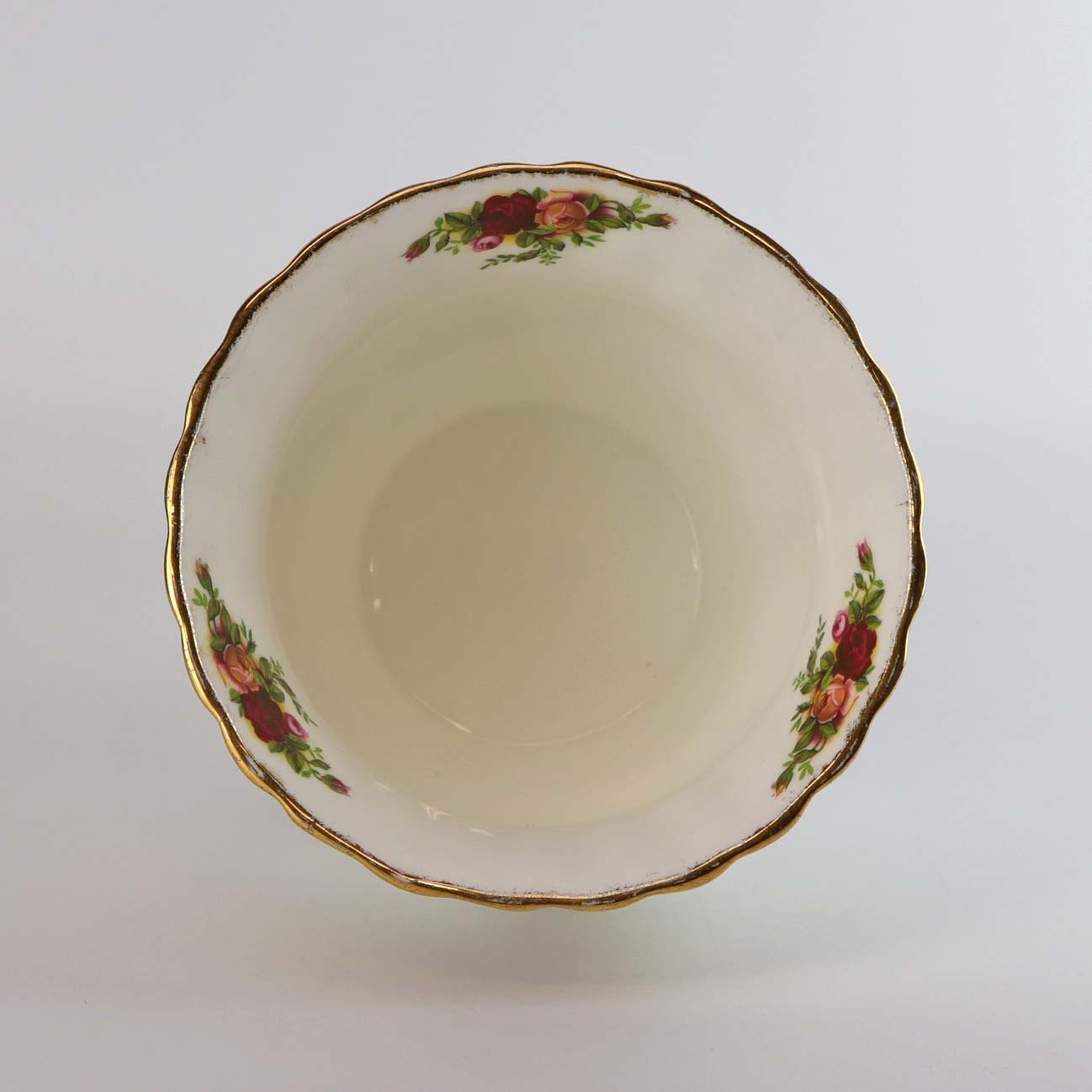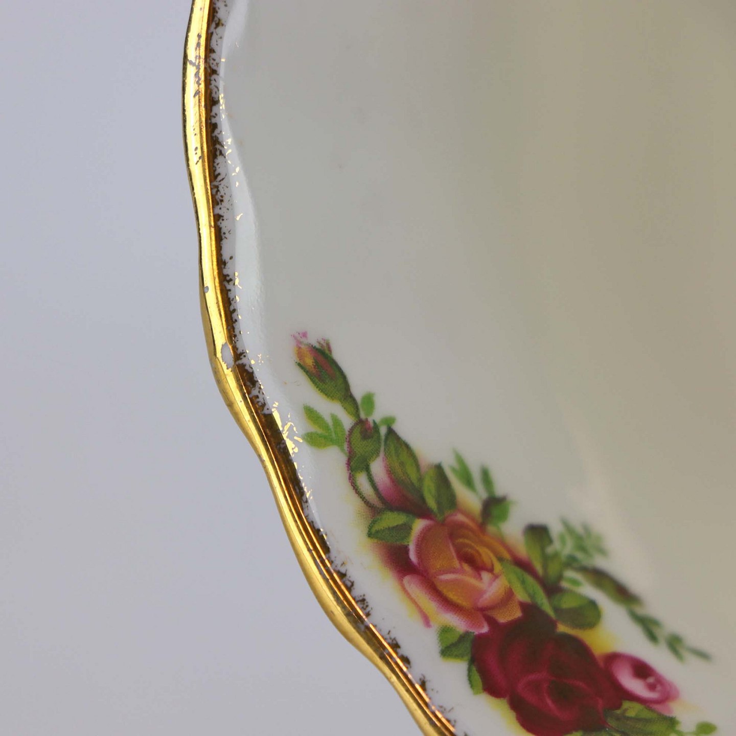 Service i glat hvidt porcelæn med motiv af farverige roser. Topkanten har en let bølget form belagt med gylden dekoration.