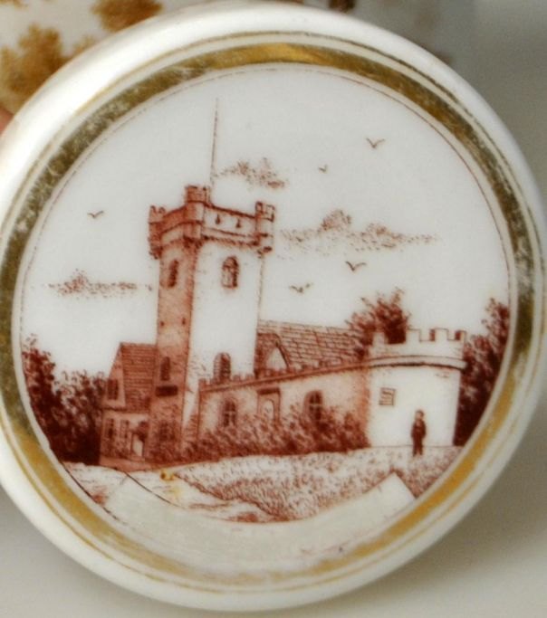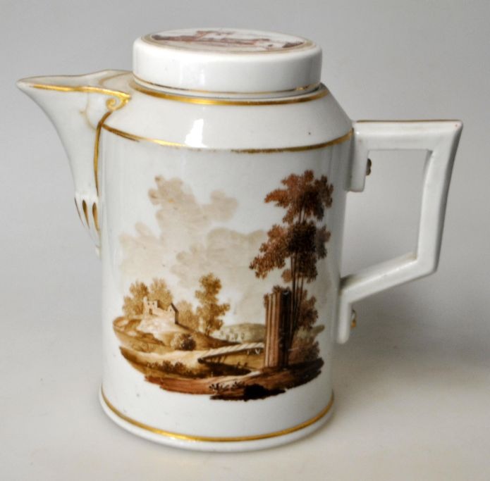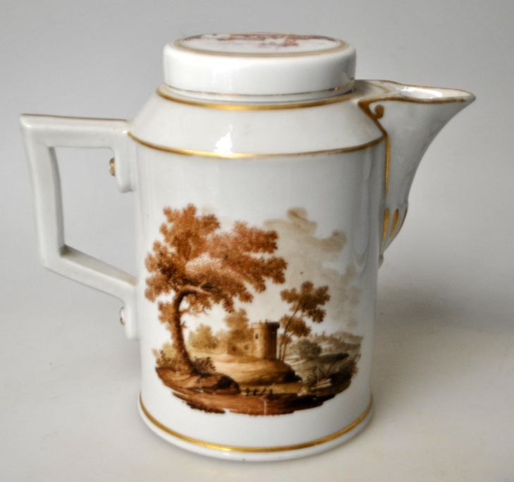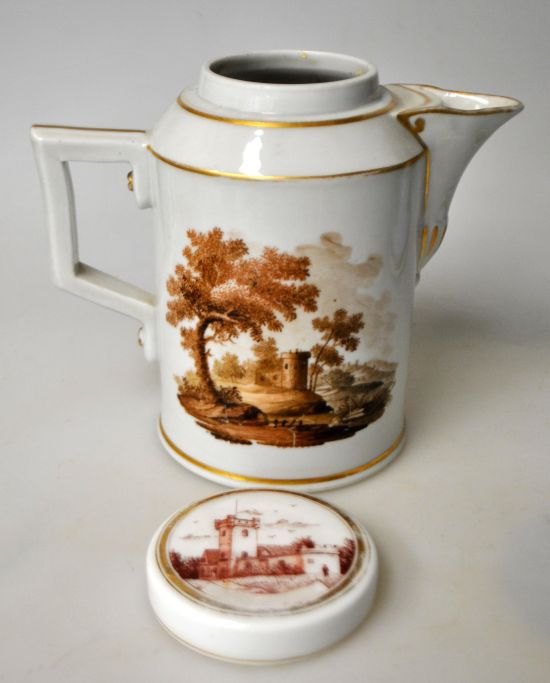 Antik tysk kaffekande ca. 1840. J. G. W Greiners Enke og Greiners Enke & Leers. Håndmalede brunlige dekorationer med borge på siden og på låget. Med forgyldninger. Stemplet. Højde.: 14 cm.