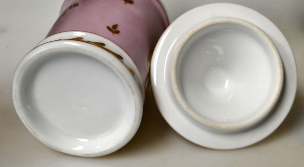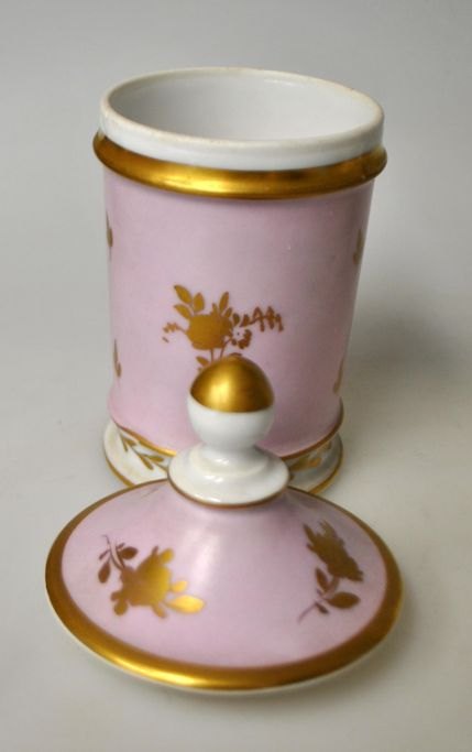 German hand-painted porcelain lidded jar, 19th century. White porcelain with pink overpaint. Midterfeldt decorated with flower bouquet. Additional gilt strewn flowers and tendrils on corpus. Lid decorated with lid knob and gilded flowers. Unsigned. H.: 15 cm.